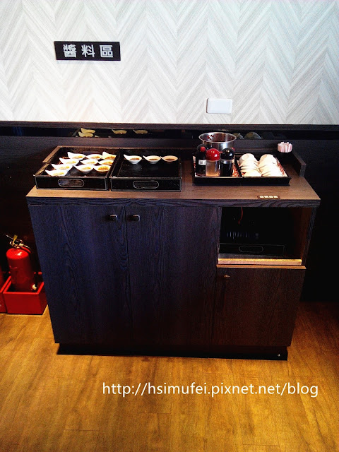 餐巾紙放在桌邊暗櫃中。 【醬料區↓】
