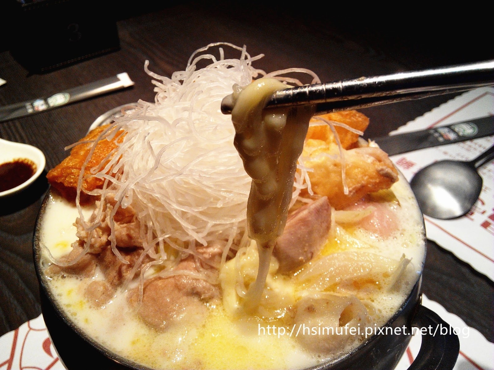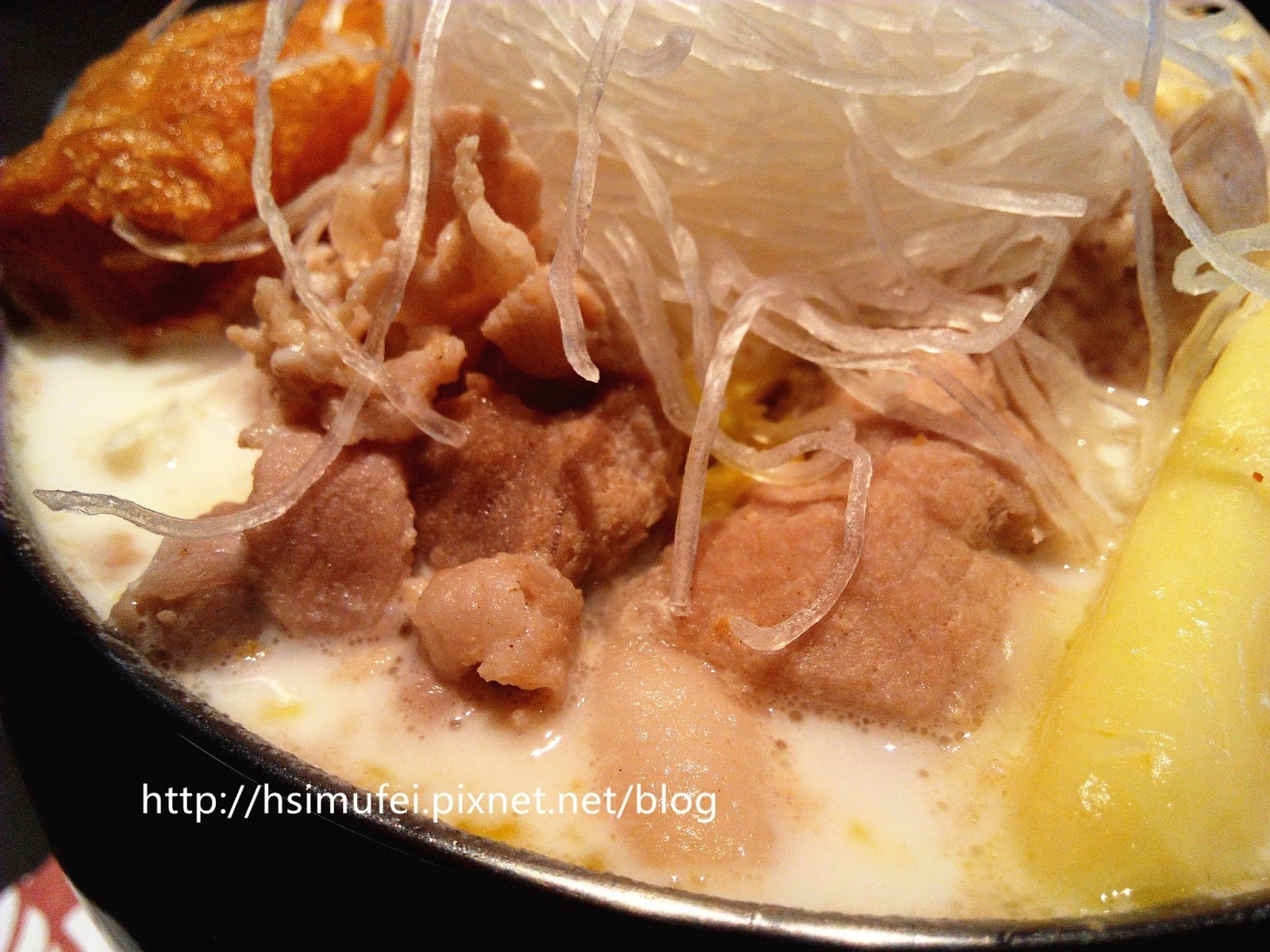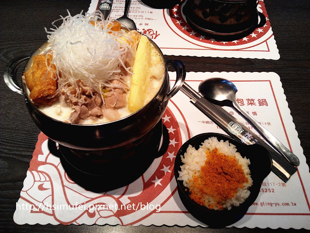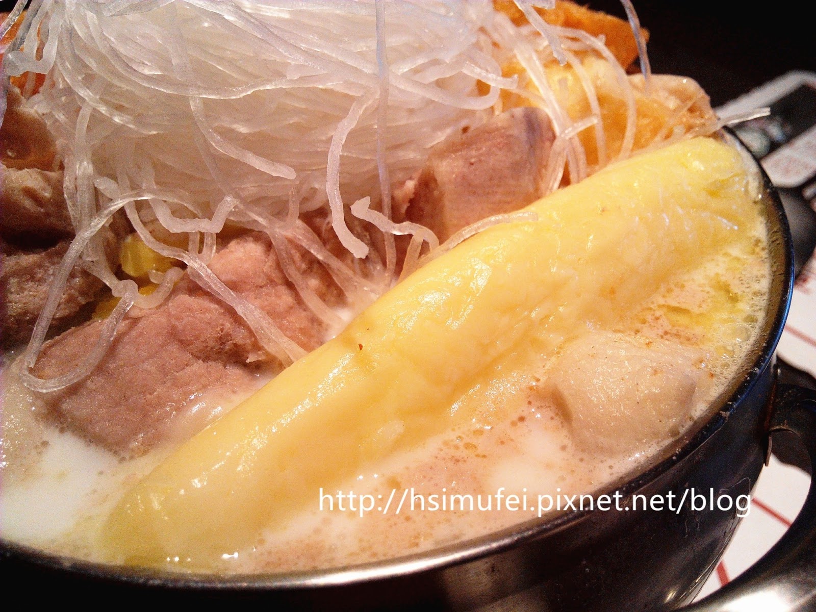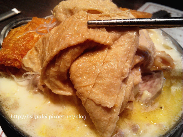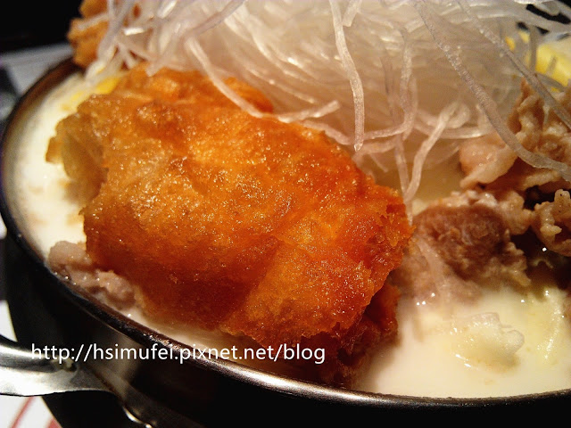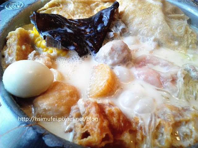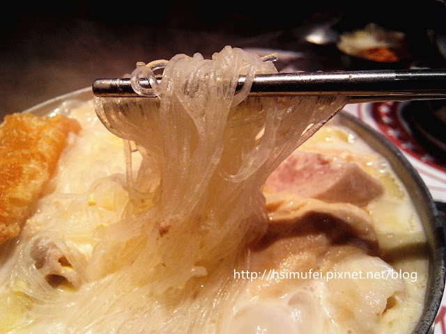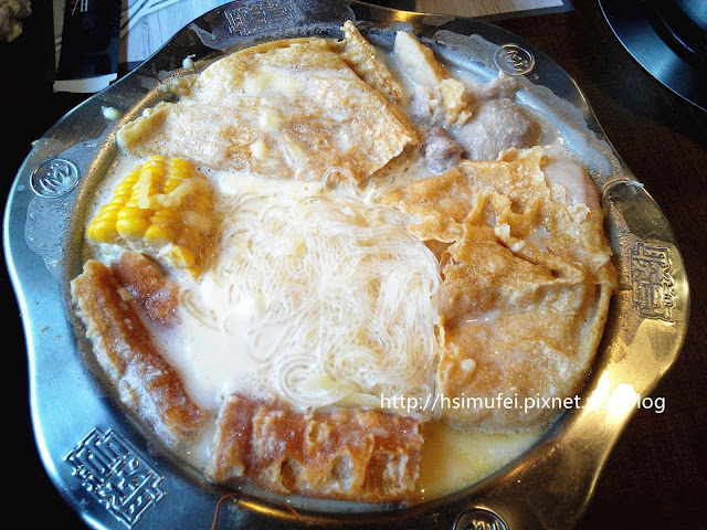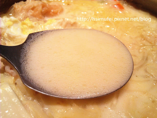 所附的白飯上撒有肉鬆,增加其風味。鍋裡的食材都已有相當的熟度,除了離開湯面的冬粉外,大多已可直接食用。開動前先來品嘗個湯頭,奶香滿濃厚,滋味甜中帶點微鹹,有點玉米濃湯的fu。