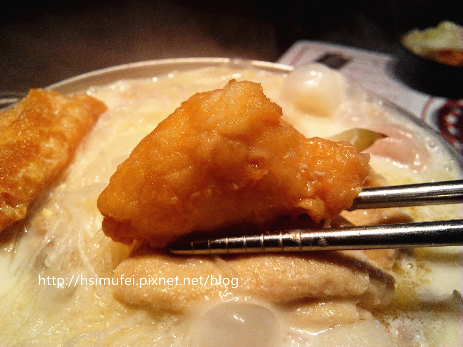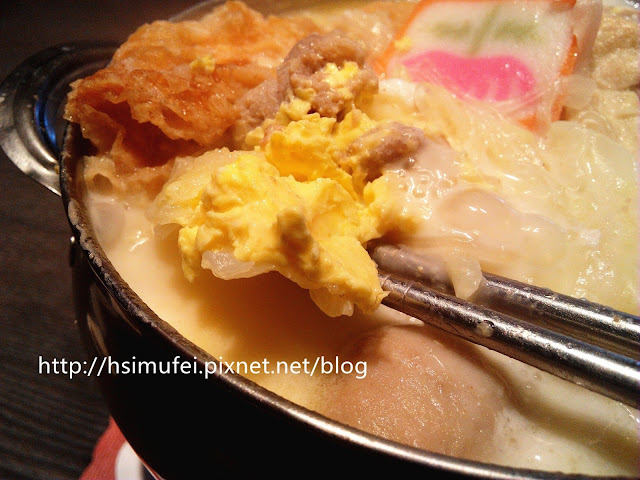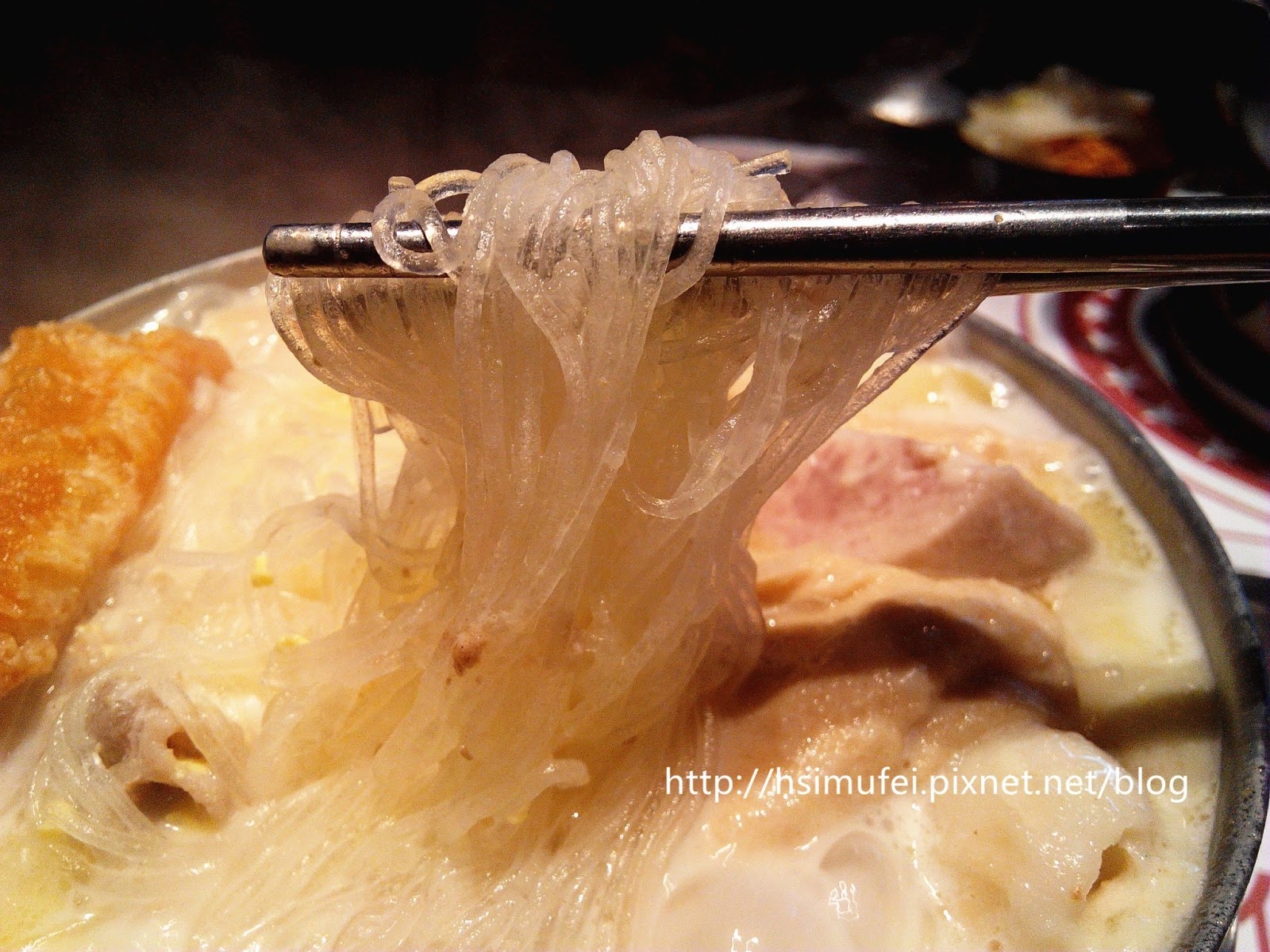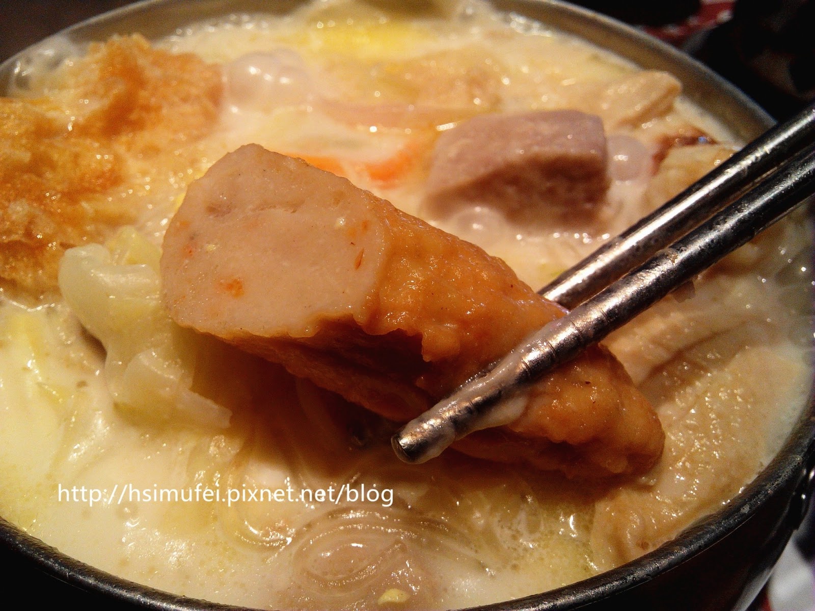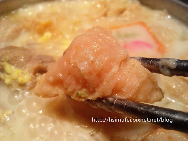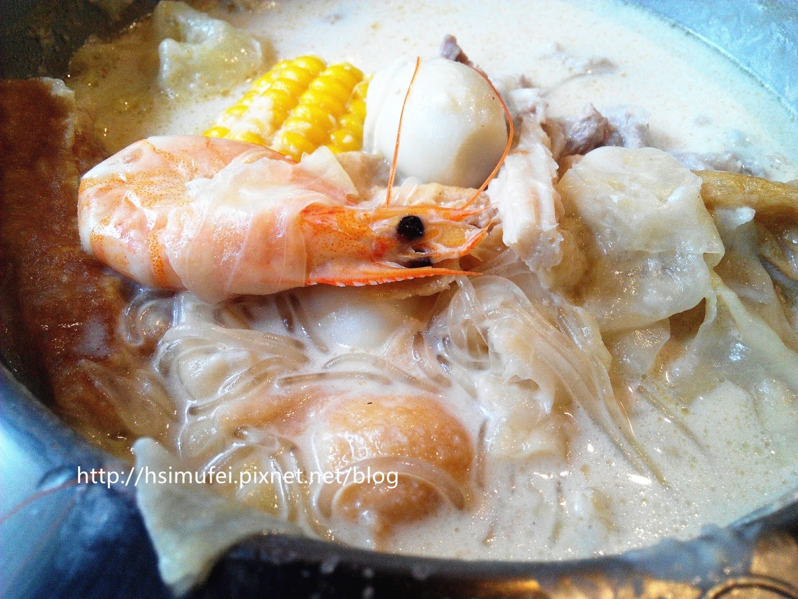 所附的白飯上撒有肉鬆,增加其風味。鍋裡的食材都已有相當的熟度,除了離開湯面的冬粉外,大多已可直接食用。開動前先來品嘗個湯頭,奶香滿濃厚,滋味甜中帶點微鹹,有點玉米濃湯的fu。