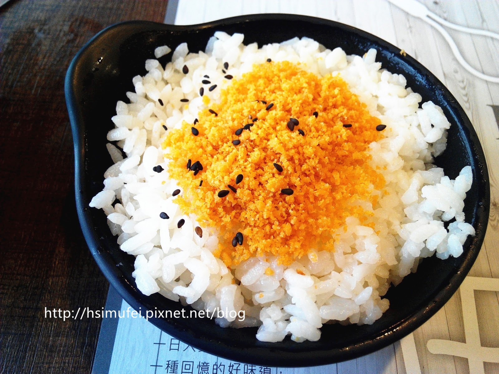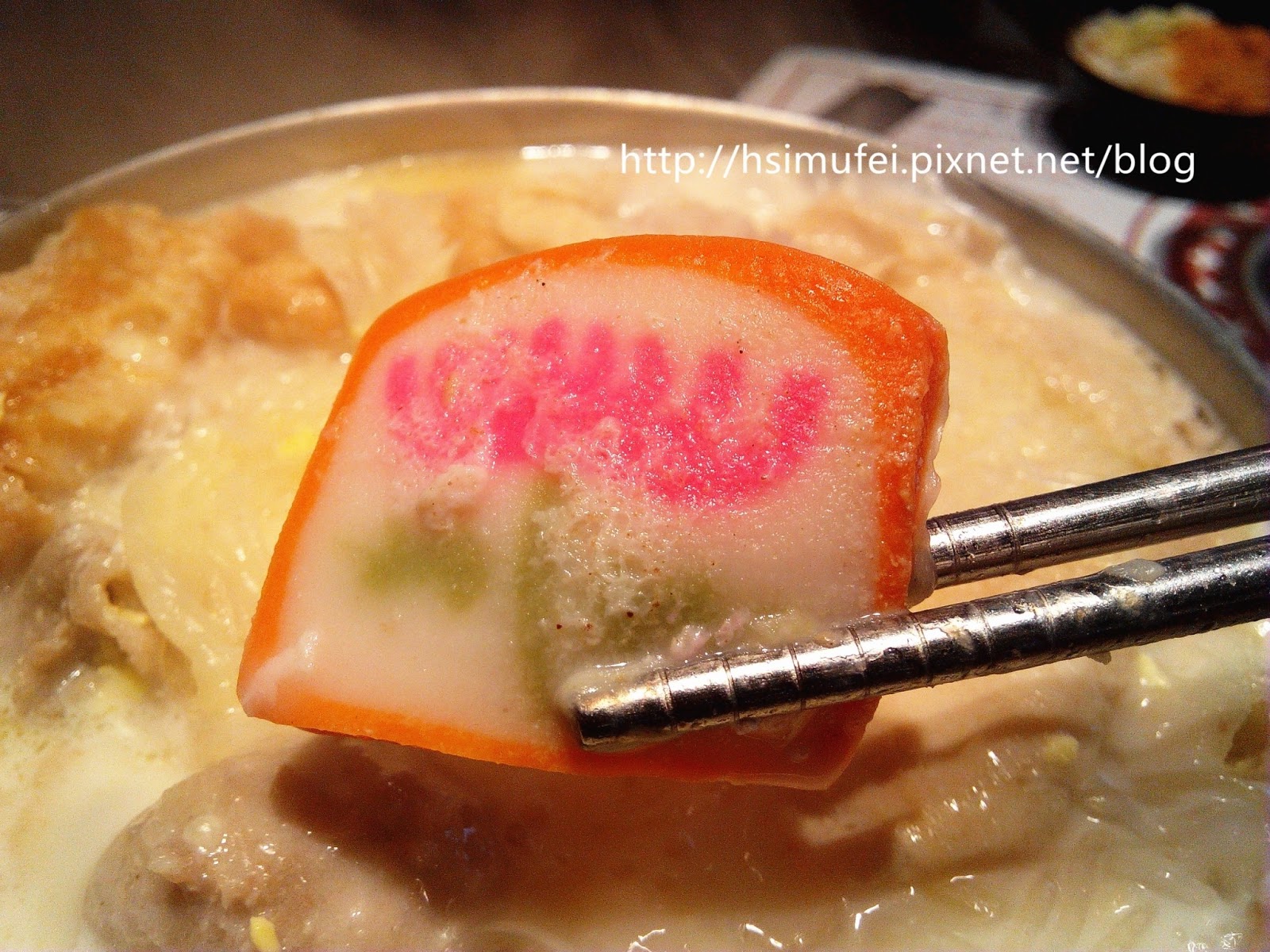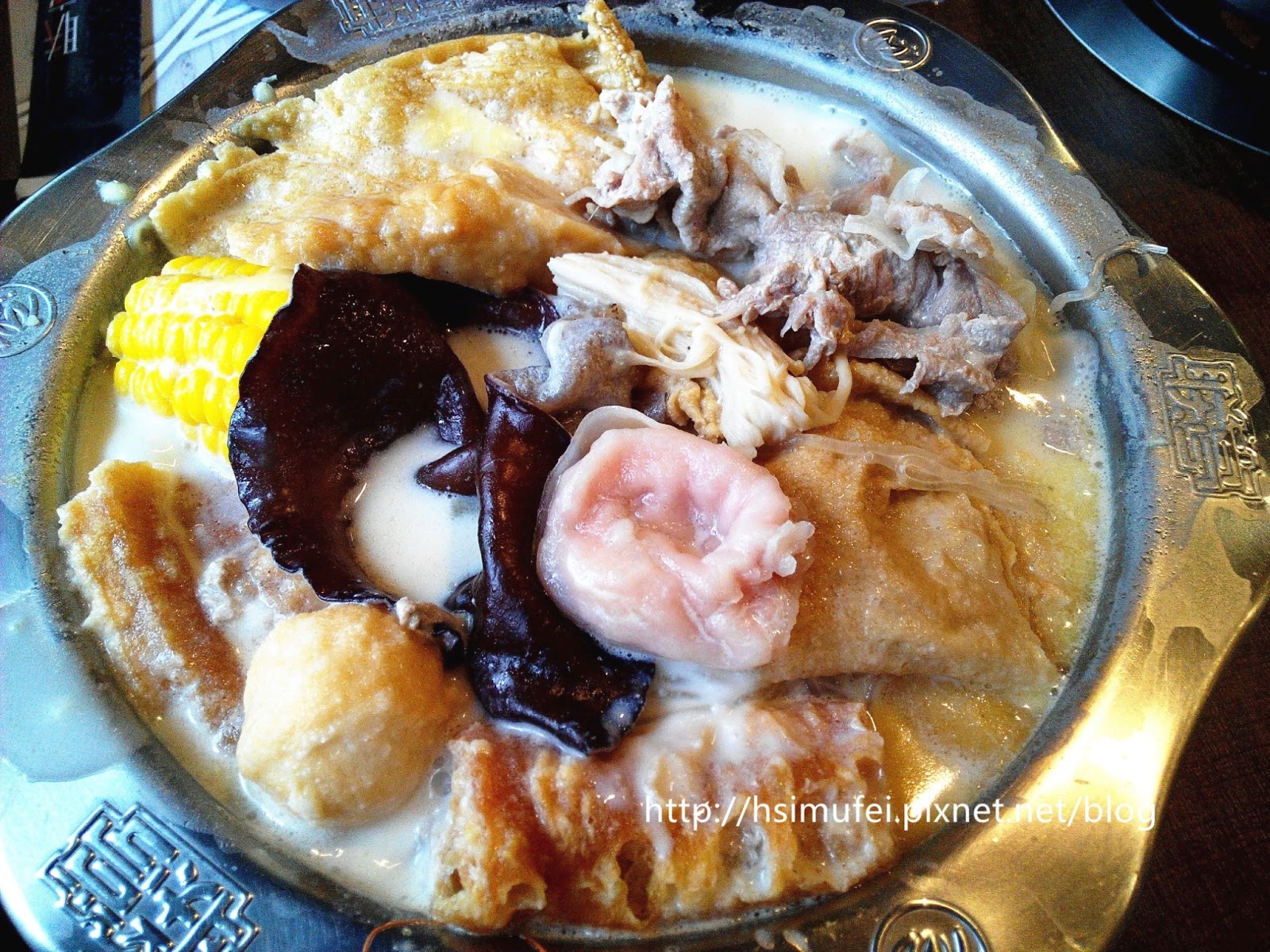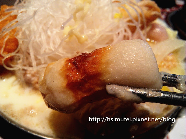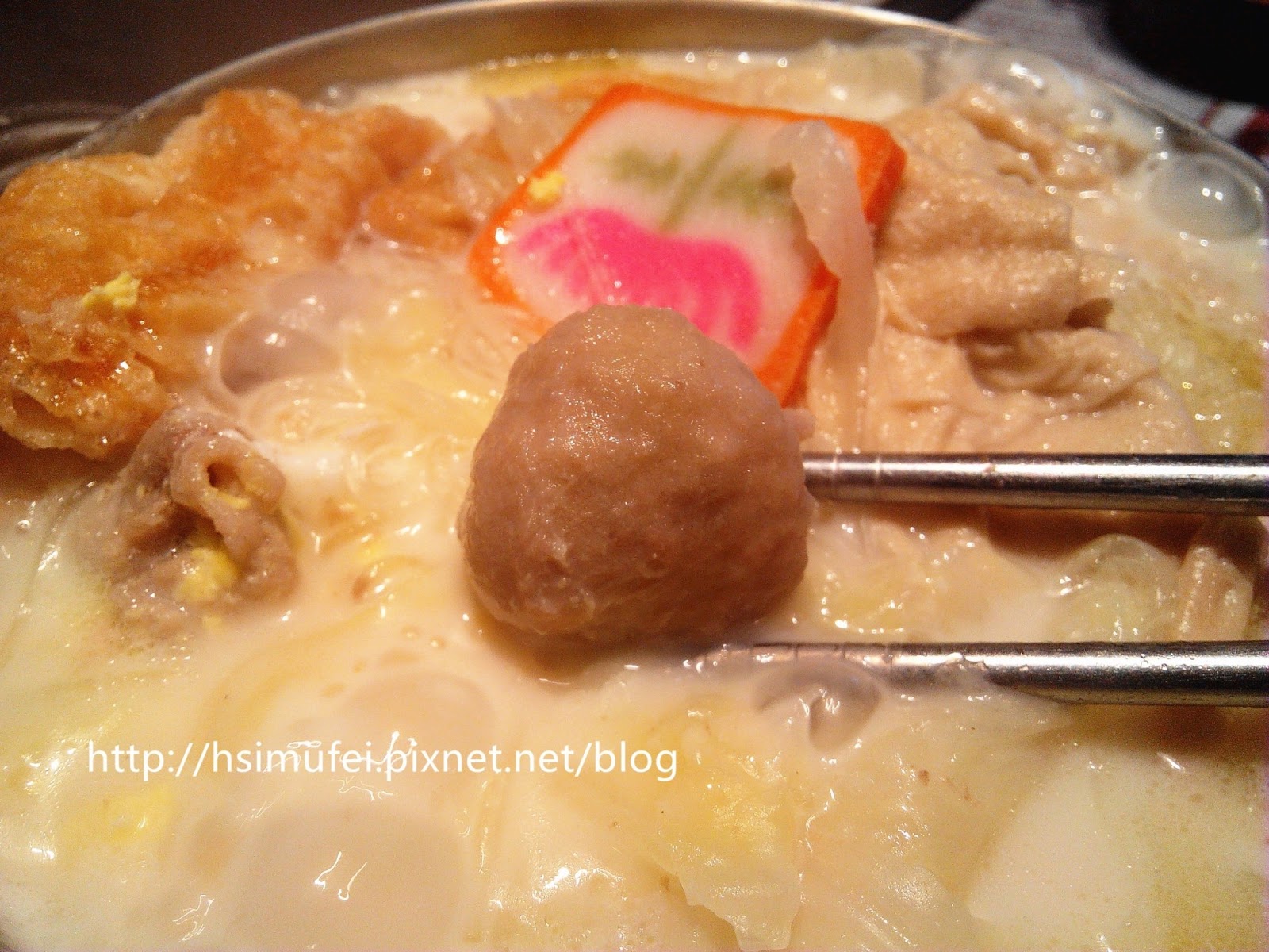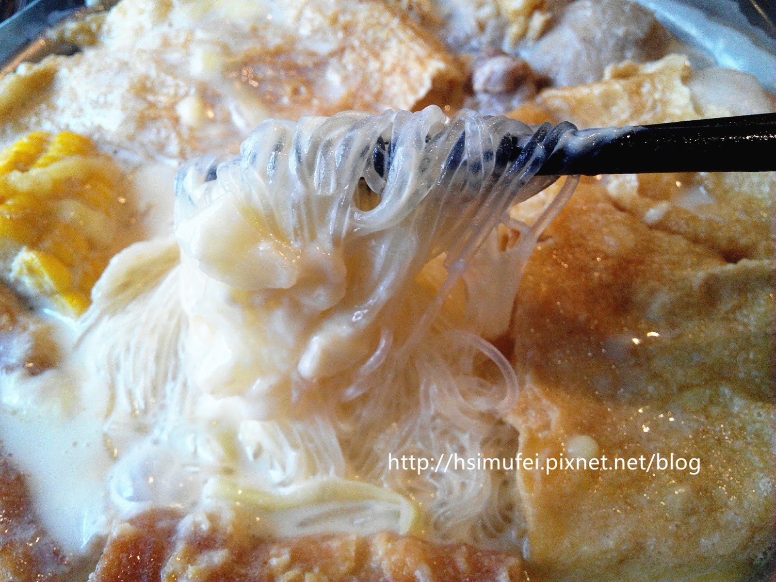 所附的白飯上撒有肉鬆,增加其風味。鍋裡的食材都已有相當的熟度,除了離開湯面的冬粉外,大多已可直接食用。開動前先來品嘗個湯頭,奶香滿濃厚,滋味甜中帶點微鹹,有點玉米濃湯的fu。
