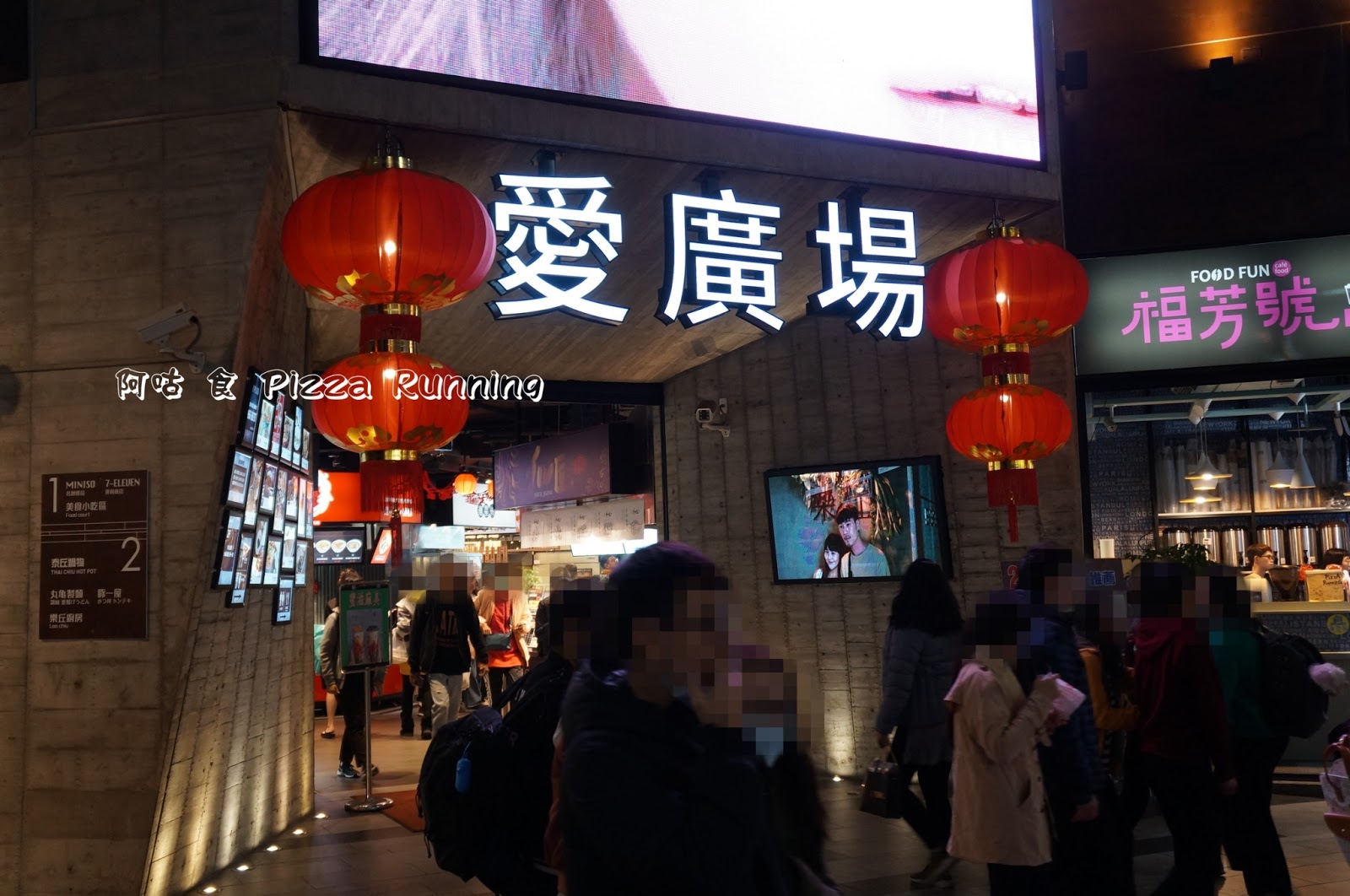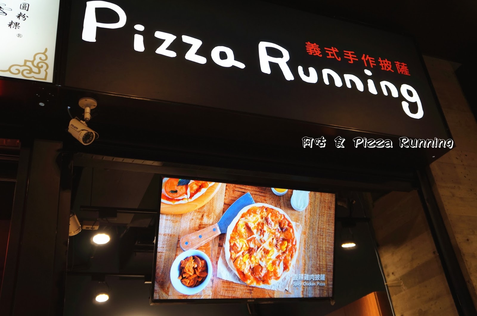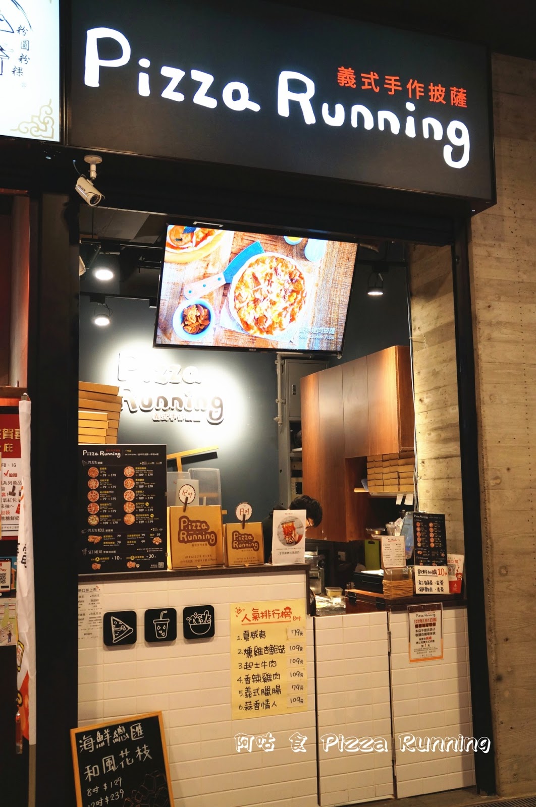 店家位於「愛廣場」入口左側,隔壁是排著長長人龍的老虎堂,招牌為黑底白色,下方液晶螢幕播放著各口味披薩實照。