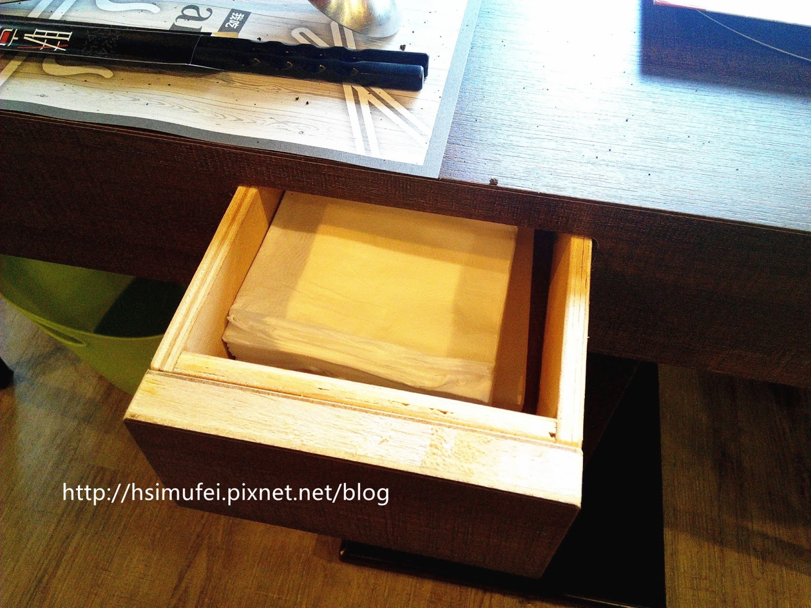 餐巾紙放置於桌面下的暗櫃中。 【MENU↓】