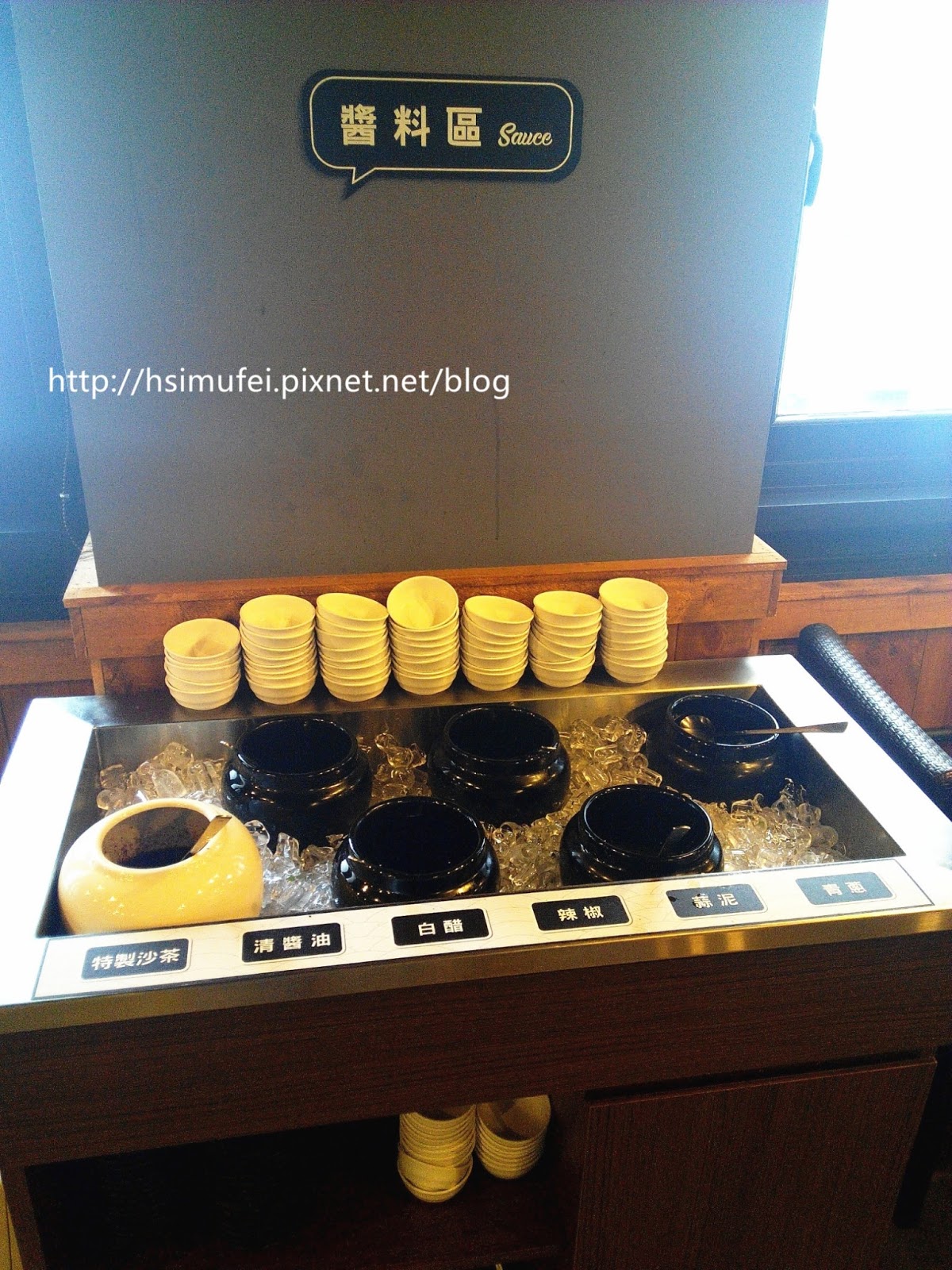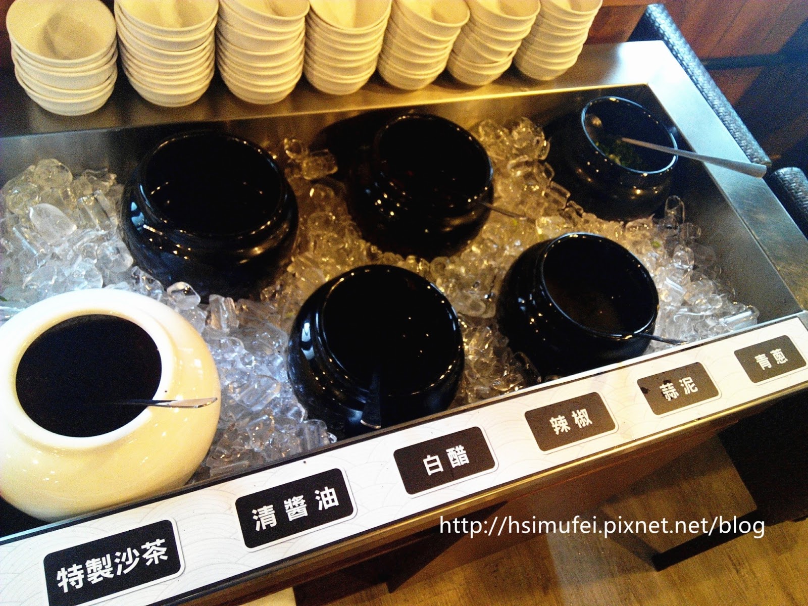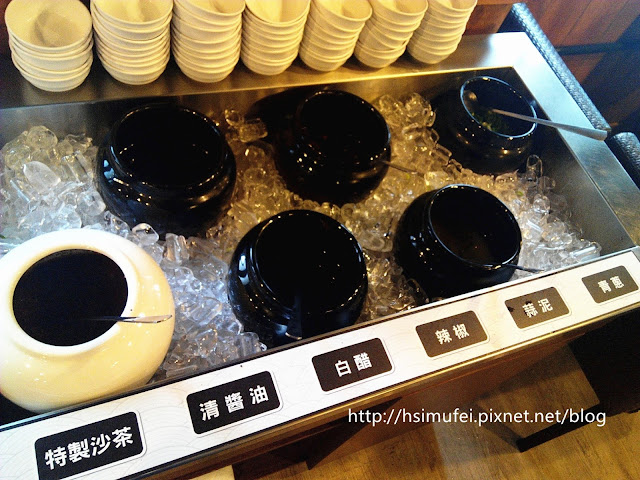 醬料區提供六種佐料,可視喜好自行調配,容器周遭放了冰塊保鮮,其中蒜泥裡也加了冰塊維持鮮度。