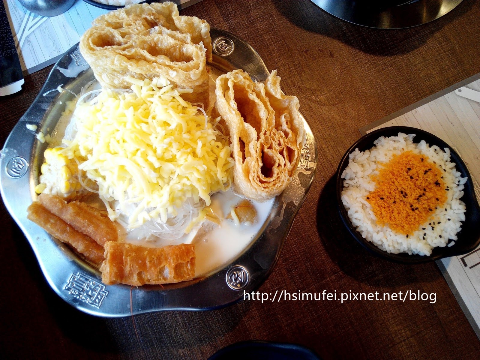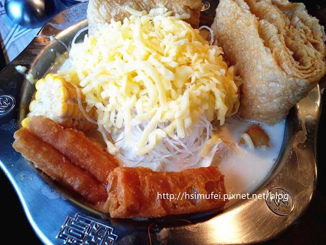 有別於偈亭的魚鬆飯,联亭把魚酥加在飯上,吃起來鹹甜鹹甜。 奶香起司鍋的滿滿配料多樣化,有油條、豆皮、玉米、冬粉、豬肉、黑木耳、魚餃、鳥蛋、金針菇、魚蛋、貢丸、魚丸、金干貝、白蝦、高麗菜以及起司絲。