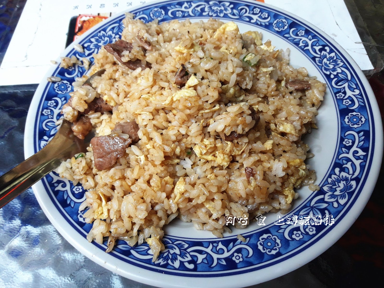 【牛肉蛋炒飯55元▼】因覺得飯類較有飽足感,我點了牛肉蛋炒飯。大約等了五分鐘左右便上桌了,看起來分量不少,不過一眼就發現其醬汁並未拌炒均勻。