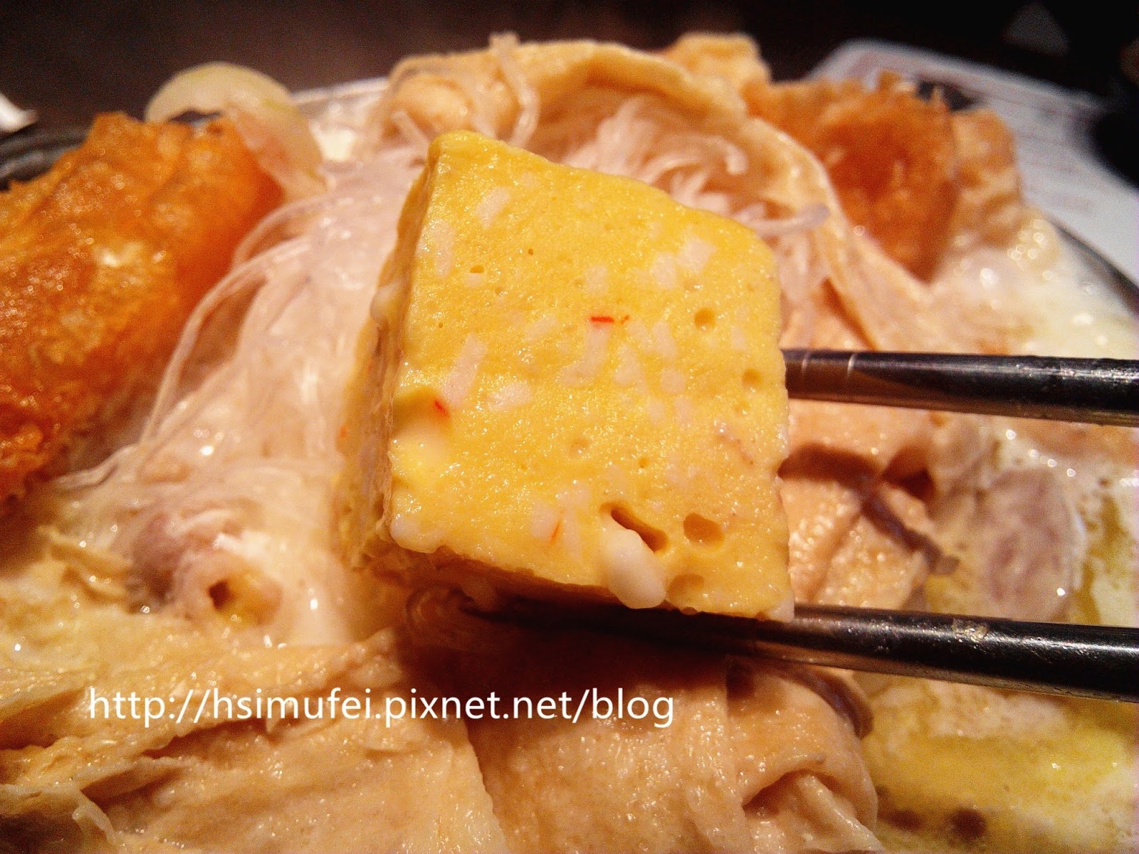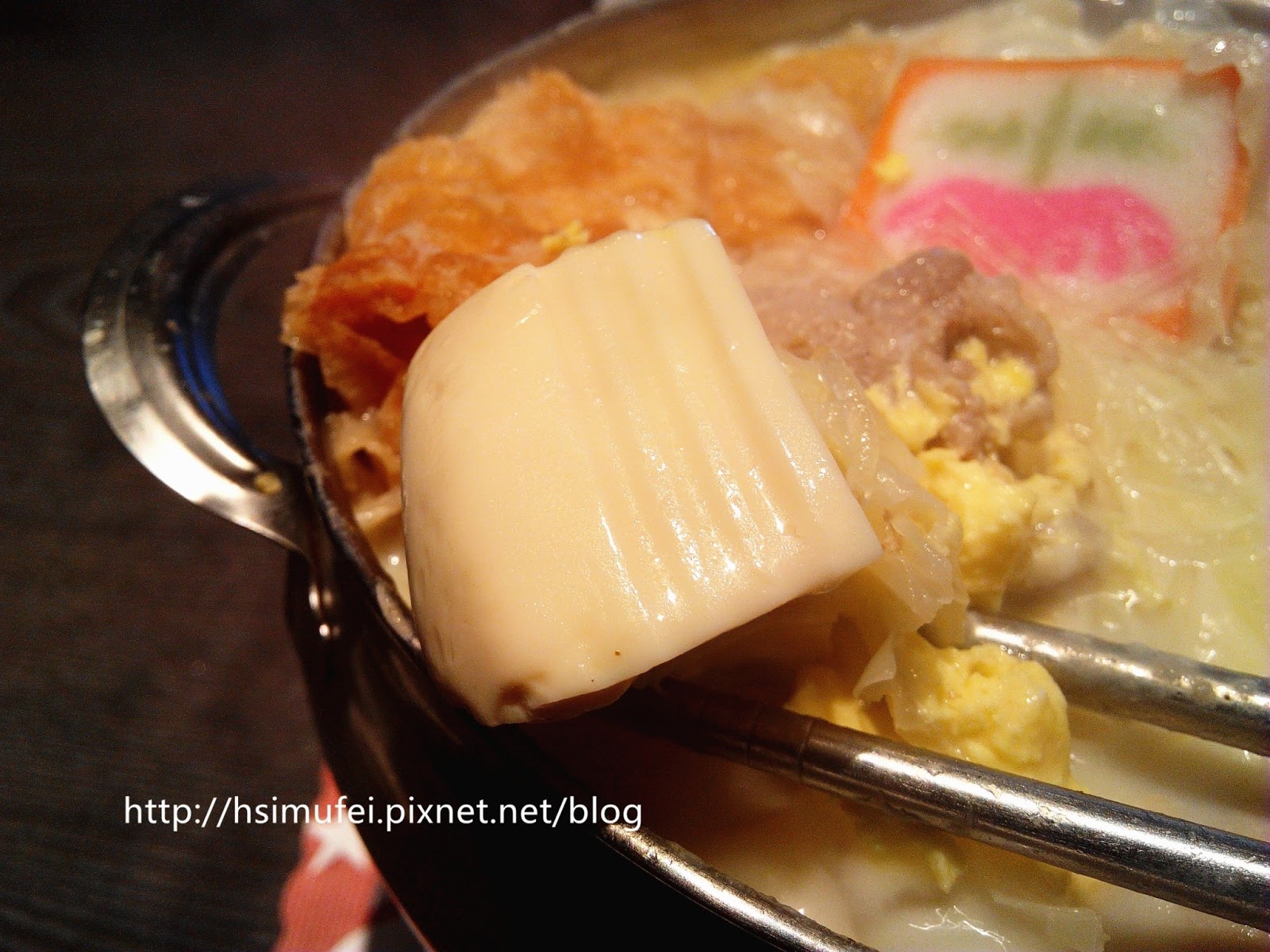 這道鍋物最大賣點當然是起士條囉!一大條橫亙在鍋裡,逐漸受熱融化入湯頭中,技術較好的人可以拉出很長的牽絲,不過不包括我。