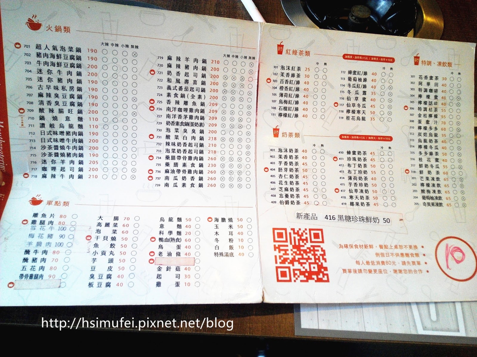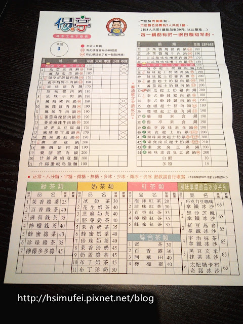 MENU上半部為鍋物類,部分餐點品名有特殊標記,有些是人氣商品,或依辣度有不同標示,另外也提供素食鍋物,每樣鍋物都附有一碗白飯。低消為兩人共用一鍋,第三人起每人需加收30元。
