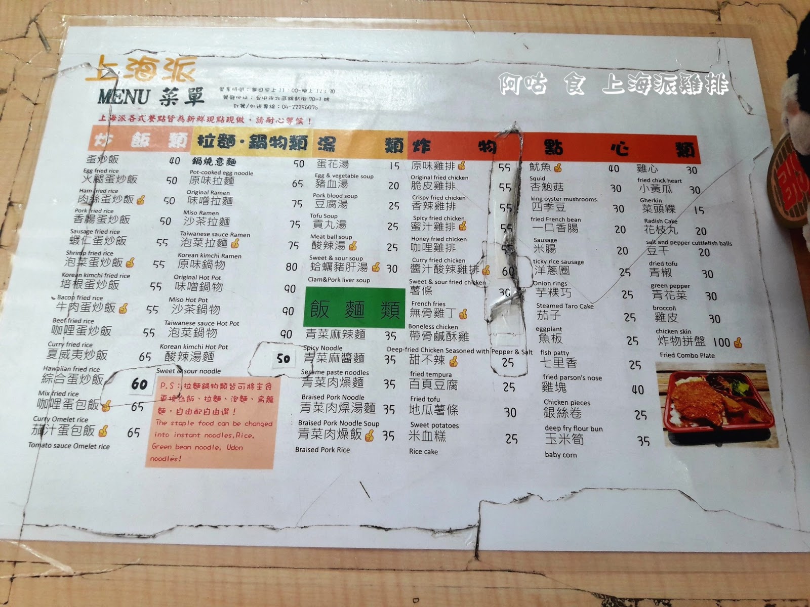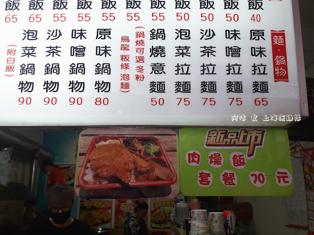櫃檯上方與左側門柱為各項餐點價目表,有炒飯類、拉麵鍋物類、湯類、飯麵類、炸物點心類,選擇性相當多樣。