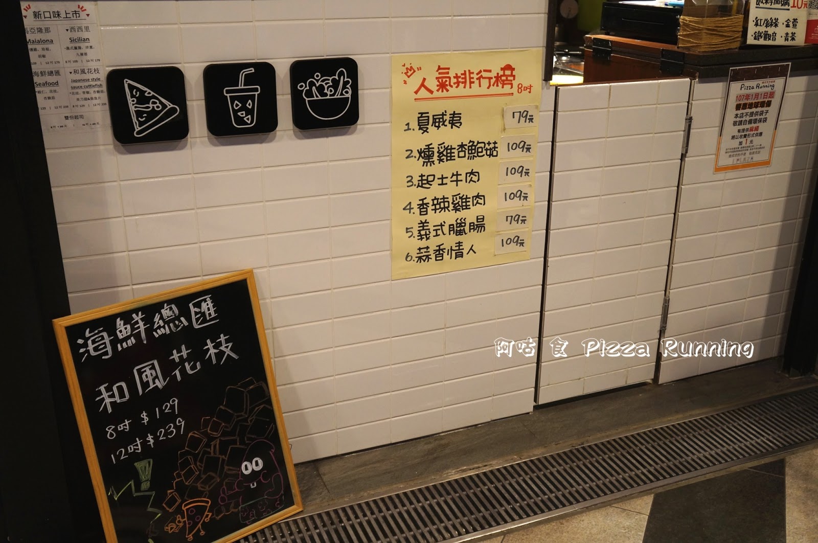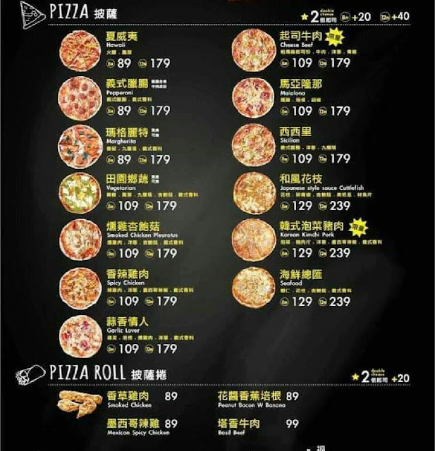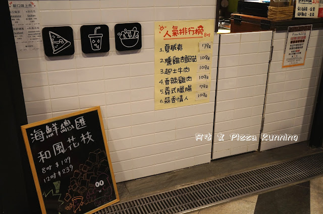 櫃檯下方貼有人氣排行榜可參考。左下方手寫板內容為當時推出的新口味。 櫃檯置有價目表,提供的餐點有披薩、披薩捲與套餐,各口味價目與餡料內容均清楚標示,尺寸分為 8吋與12吋兩種,另可加價20、40元增添起司用量。