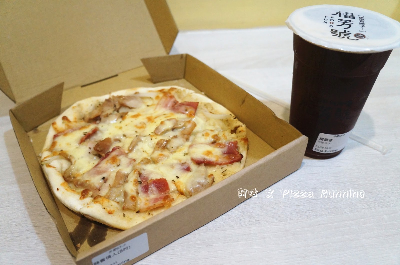若未事先去電訂餐,現場購買需等候約五到十分鐘左右。接著便是往愛廣場入口右側的「福芳號」領取飲料囉!點購飲料已做好放於冰櫃中冷藏,到店後可立即憑單拿取。【蒜香情人套餐 A 119元▼】披薩外盒側邊標有口味、尺寸以及購買時間。 打開盒蓋,濃烈的蒜香味立即撲鼻而來。
