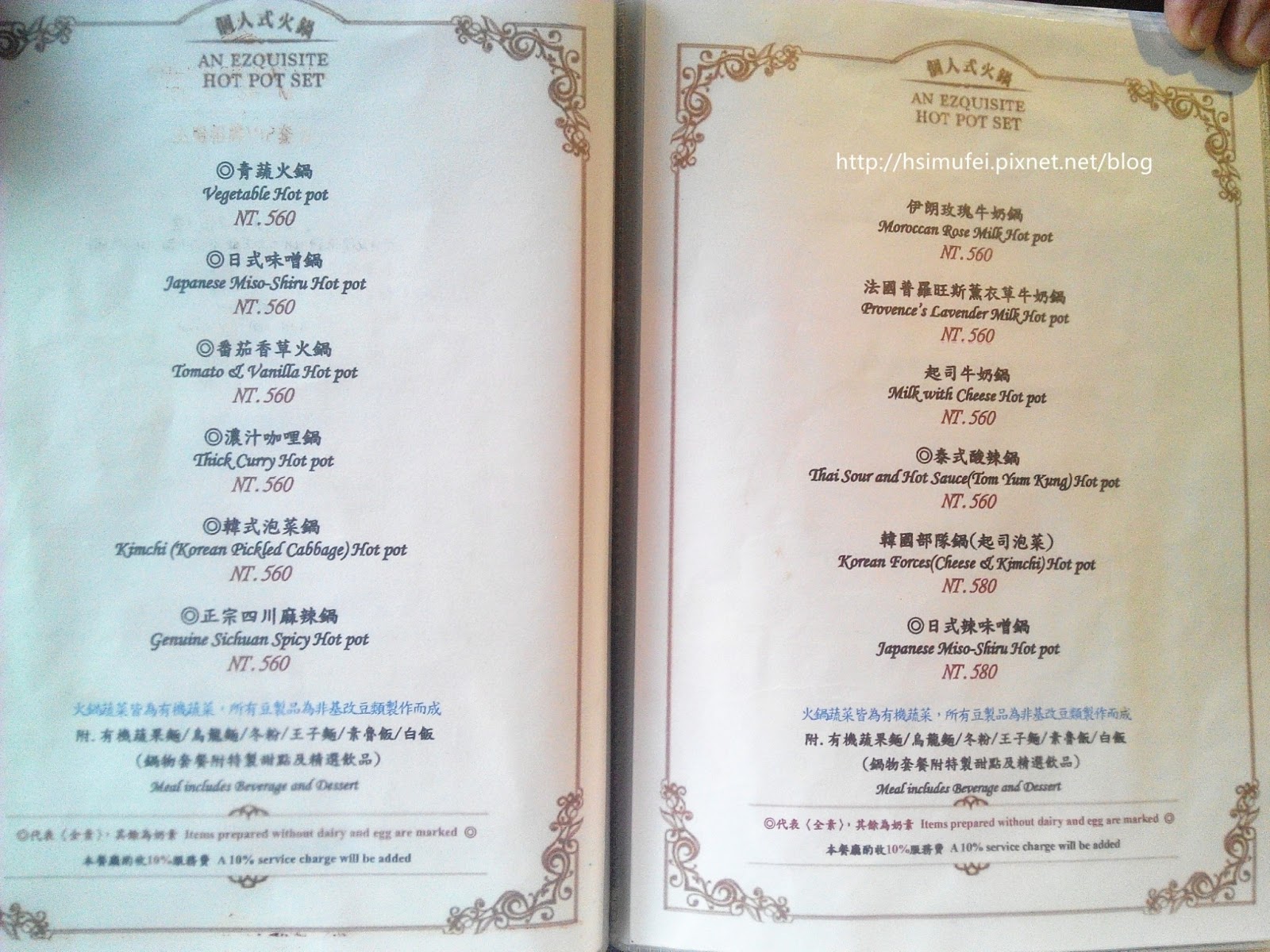 火鍋類套餐提供有附餐、特製甜點與精選飲品。附餐選擇很多元,除了一般較常見的種類之外,還有蔬果麵和素肉飯。蔬果類食材都由在地有機、生機小農提供,豆製品類則以非基改豆類製成。