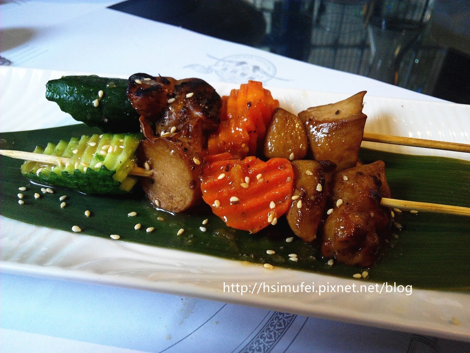 就外觀看起來有點像真的烤肉串,實則不然,內容物為杏鮑菇、紅蘿蔔、小黃瓜,並塗上鹹甜醬汁進行烤製後撒上芝麻提味,三種食材呈現了不同的口感,相當令人喜愛。