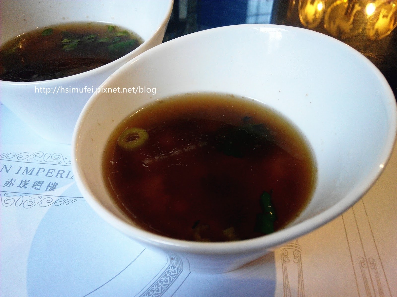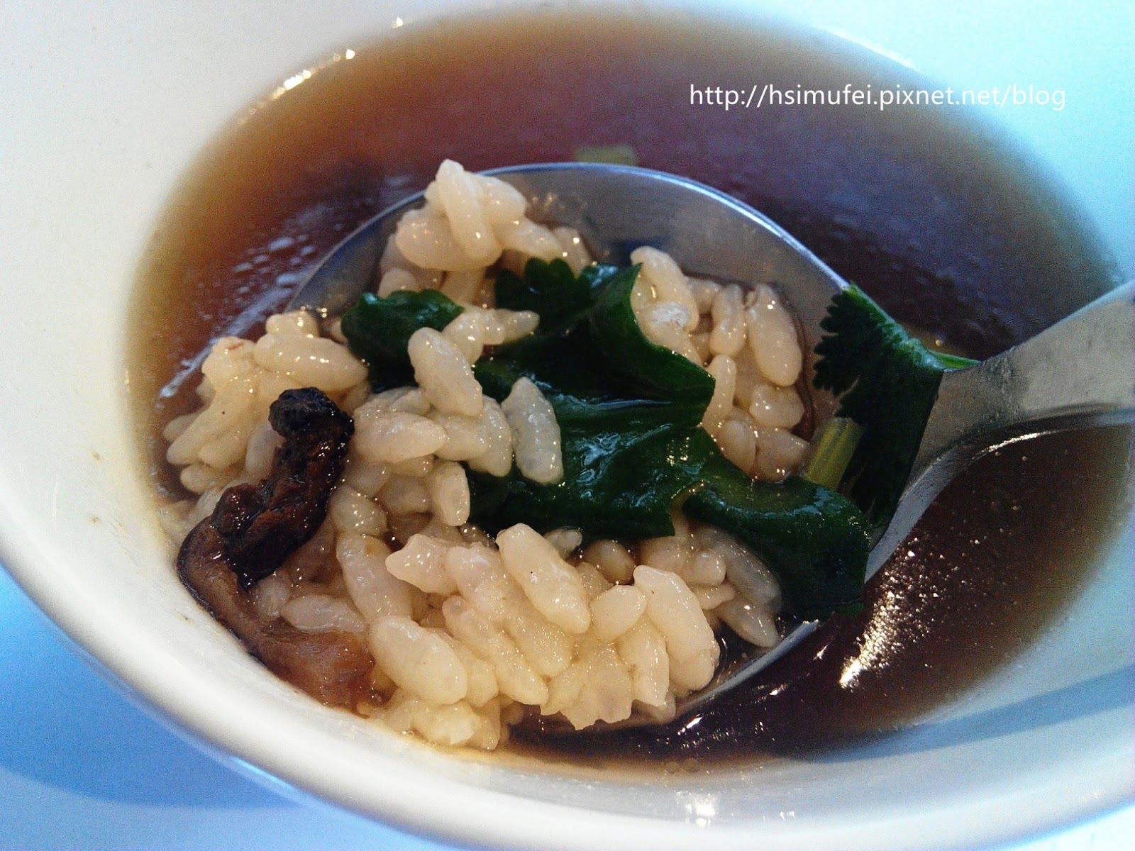 MENU上原為義大利番茄湯,但當天改為這道鹹湯粥,使用了白飯、香菜、芹菜珠與香菇烹煮,深色的湯頭蘊含著濃郁的香菇香氣。