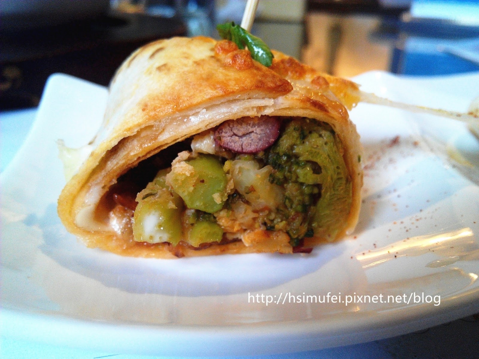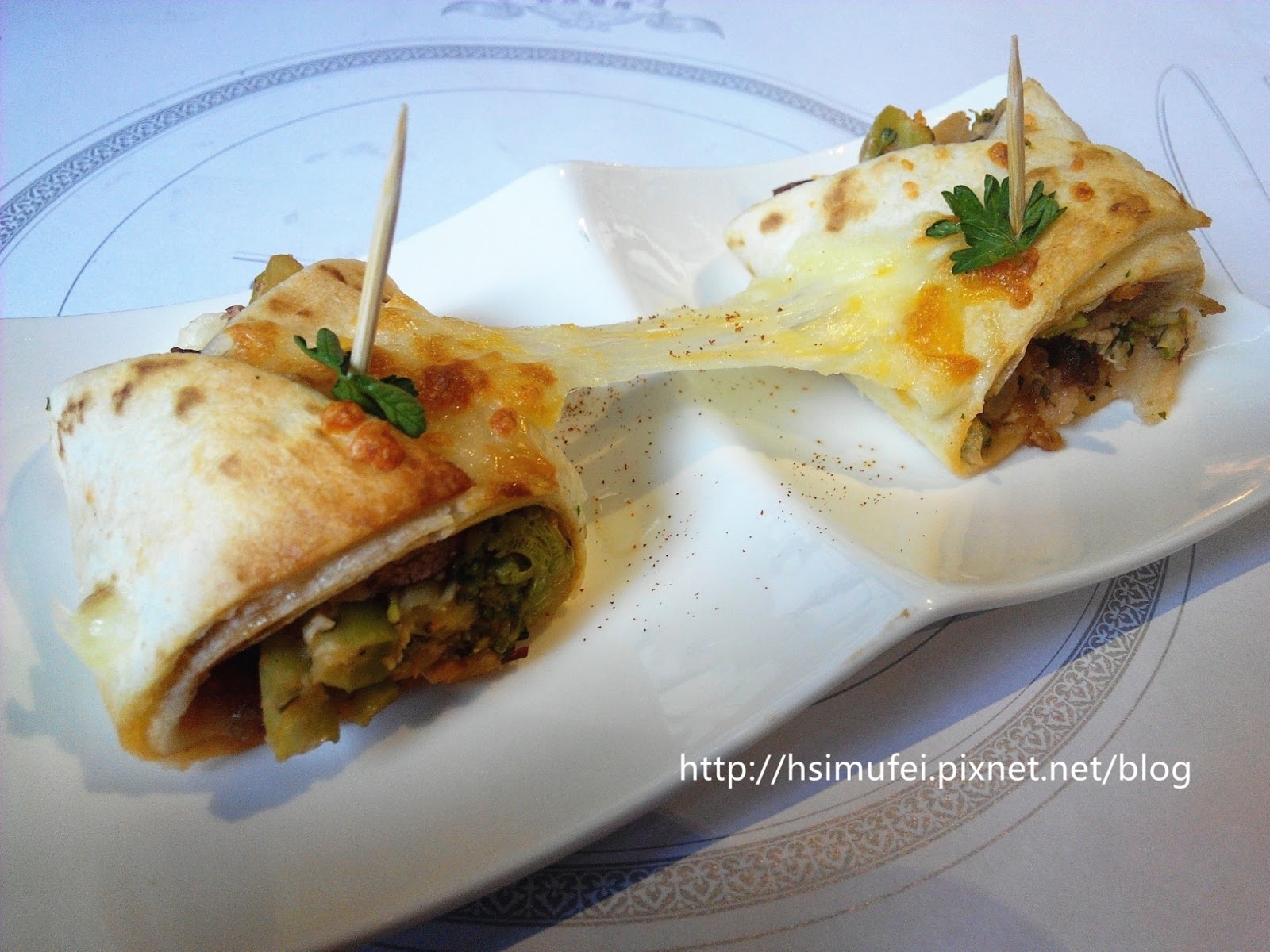 本身具有酥脆口感的墨西哥捲皮上鋪著焗烤過而牽絲的起司,外觀看起來彷彿兩份起司捲牽手蒞臨似的。裡頭包裹著以青花菜為主的餡料,此外還有紅豆、紅蘿蔔碎末與好像是素肉泥的食材,是個人非常喜愛的餐點之一。