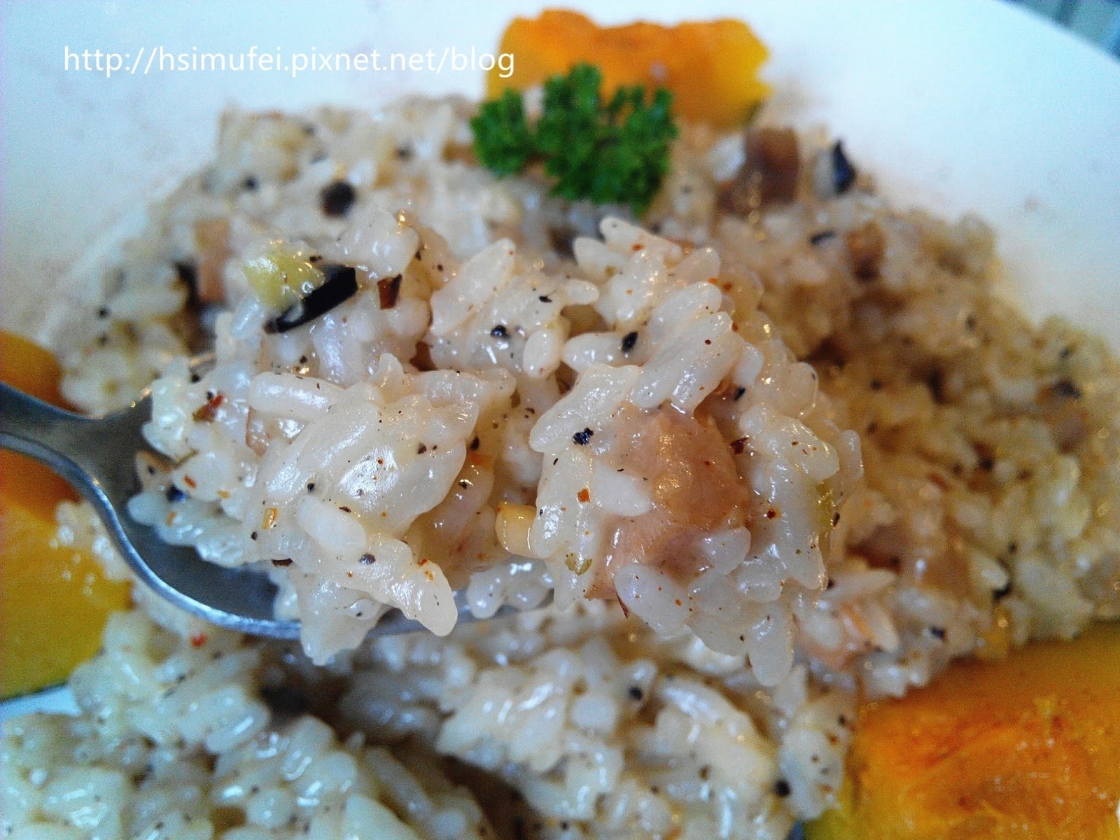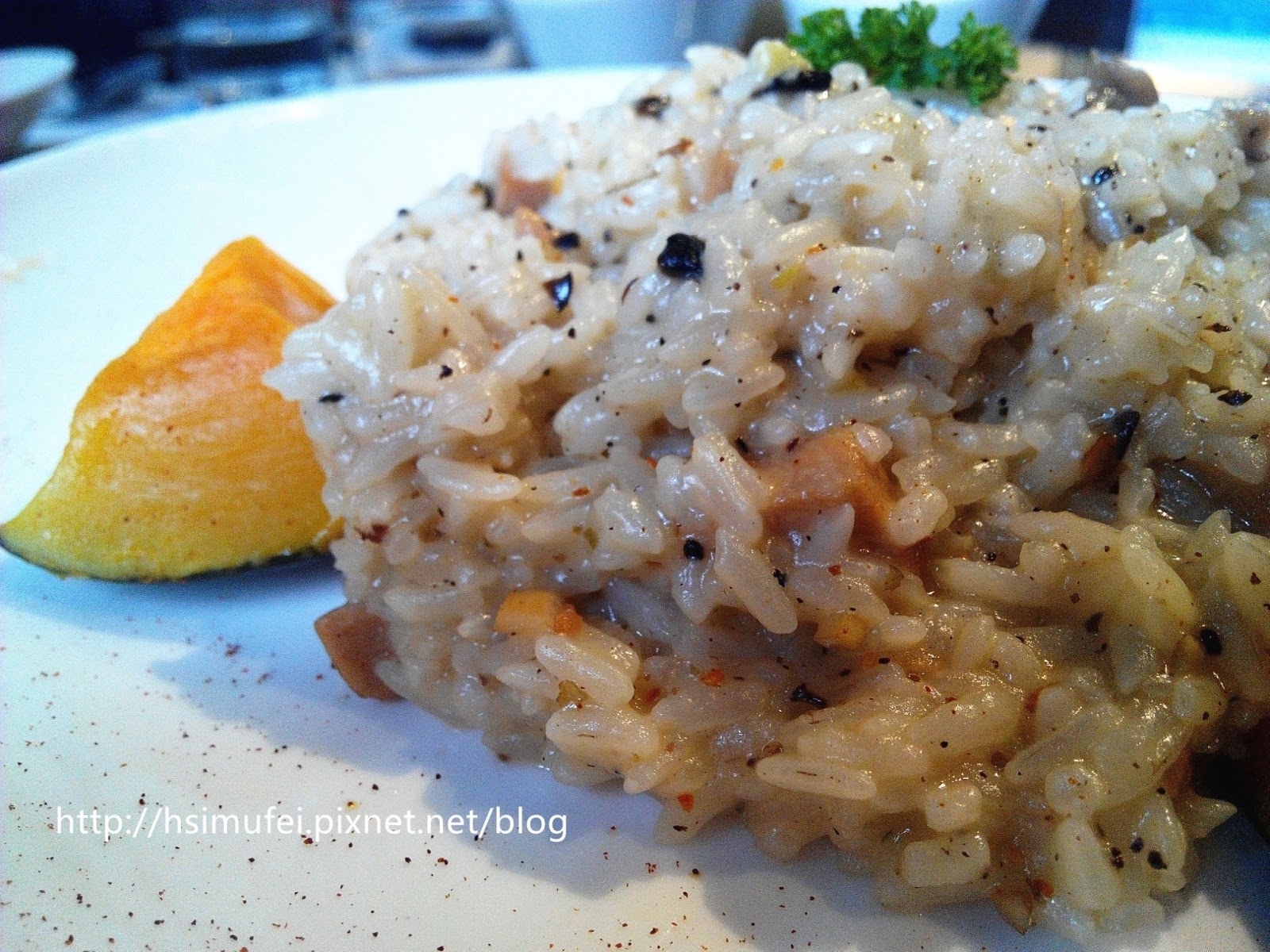 燉飯旁放有若干大塊南瓜作為陪襯。燉飯的米心不會過硬,擁有滑順濕潤口感,卻不會糊掉,松露、香料等香氣充分融入其中,用料也非常實在,處處可見松露在燉飯中的身影,除此之外也加了些素肉增加口感的豐富度。