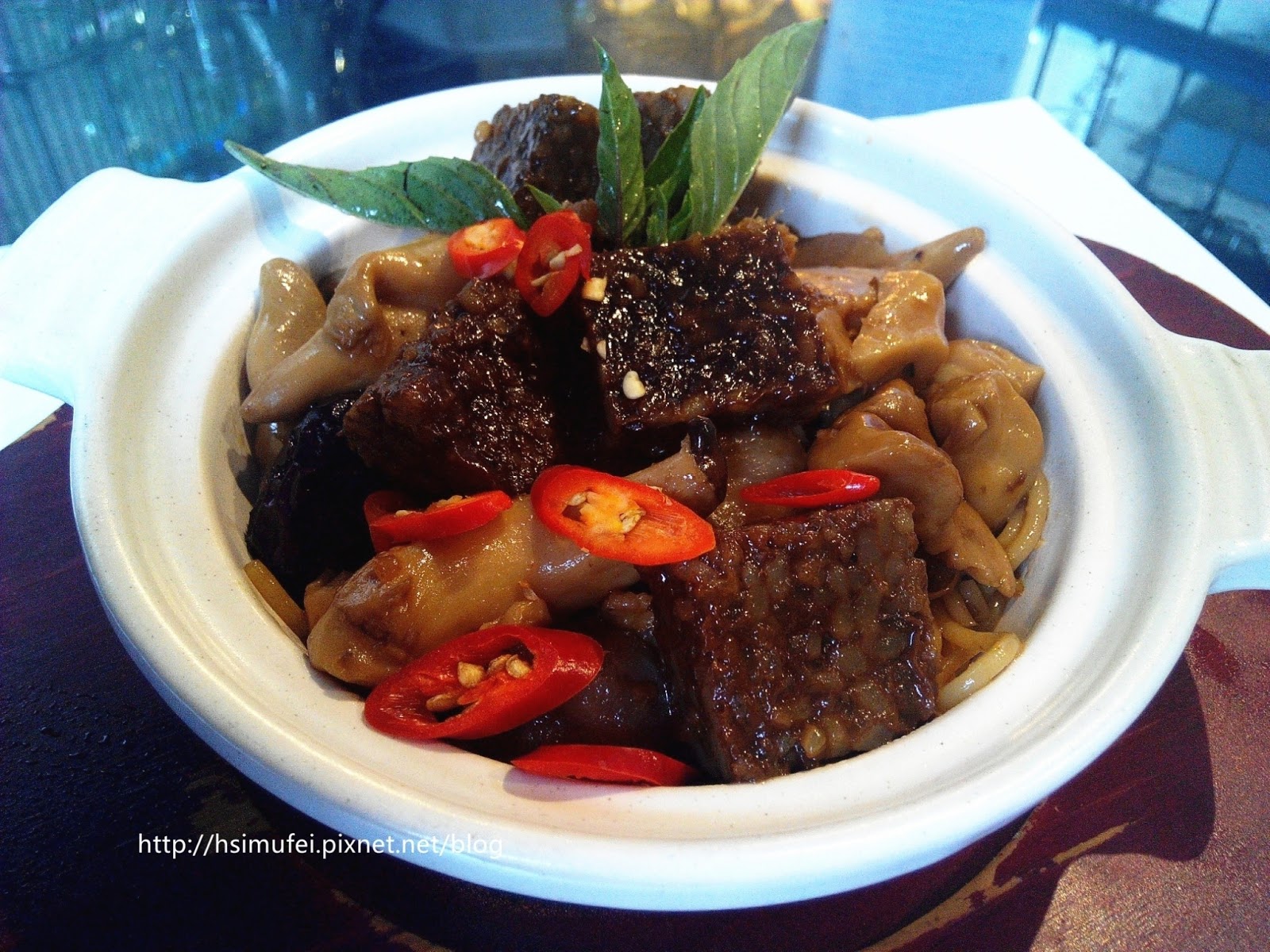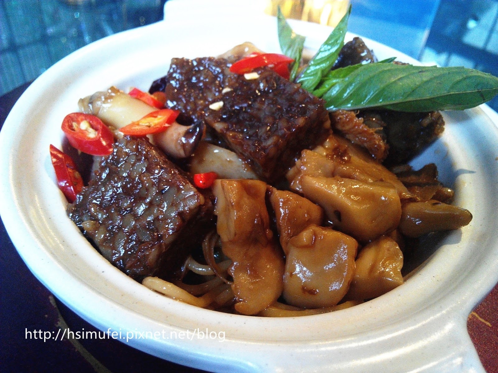 上桌時滿滿的配料真讓人找不到麵條的存在,配料以猴頭菇為主,再搭配素米血、素牛筋、薑片、紅棗等。用的是細條義大利麵,散發著十足濃郁的麻油與九層塔的香氣,麵條口感滑溜討喜,整體滋味頗有辣度,吃起來很過癮。