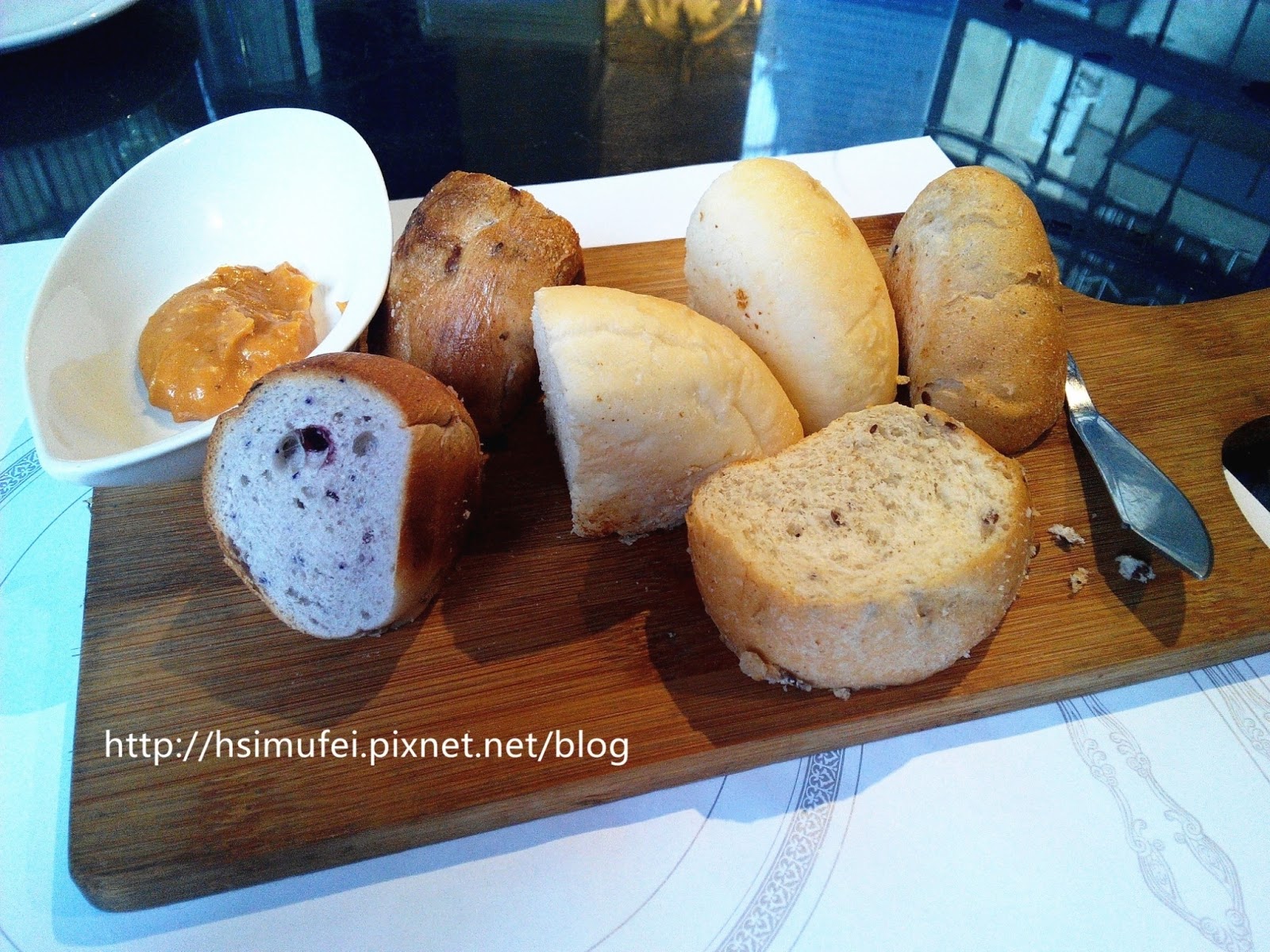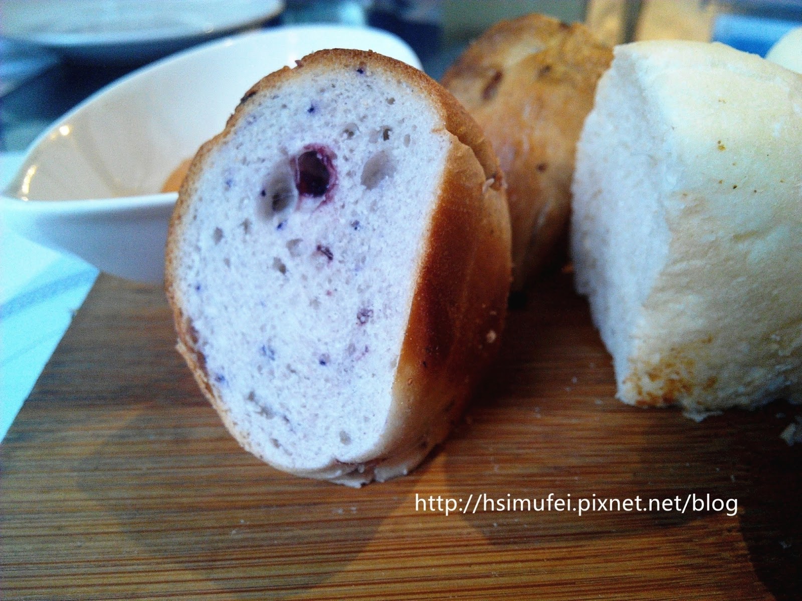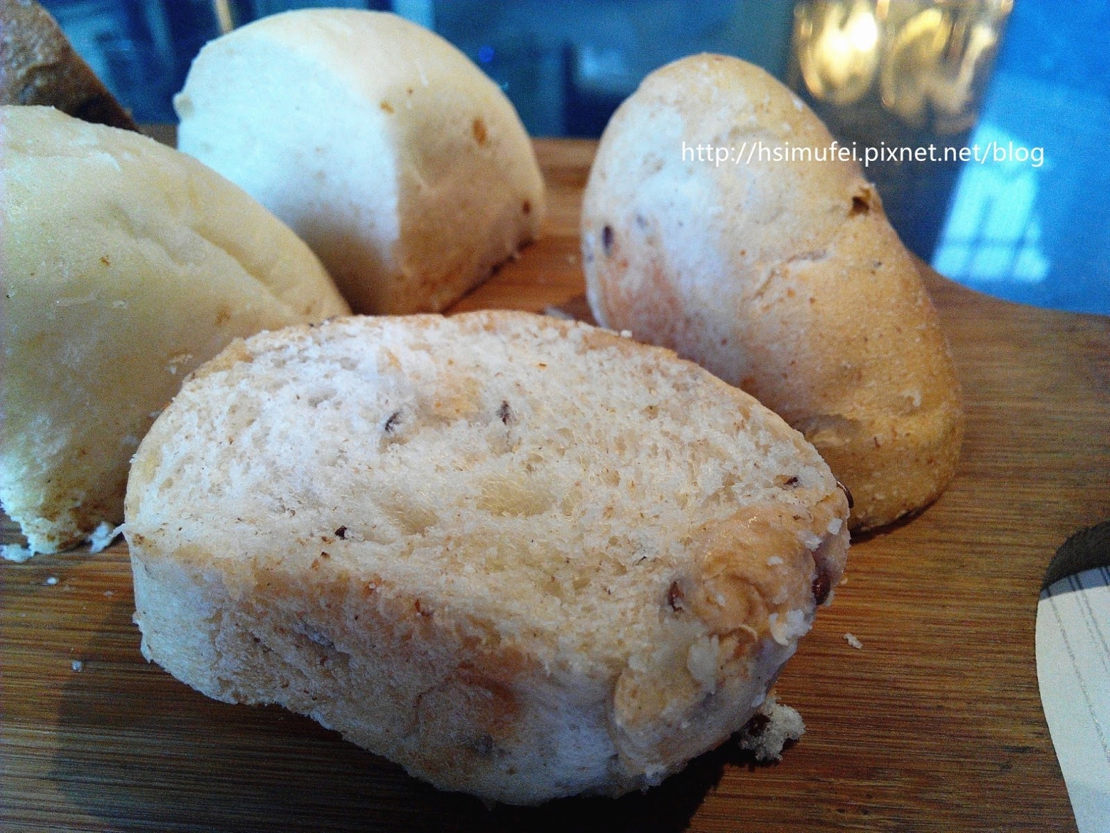 麵包共有三種,有的加入其他食材,如葡萄乾等,並附上店家調製的麵包沾醬。