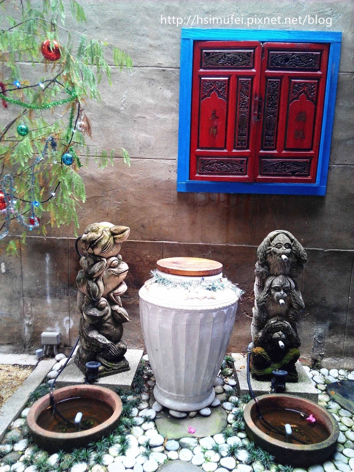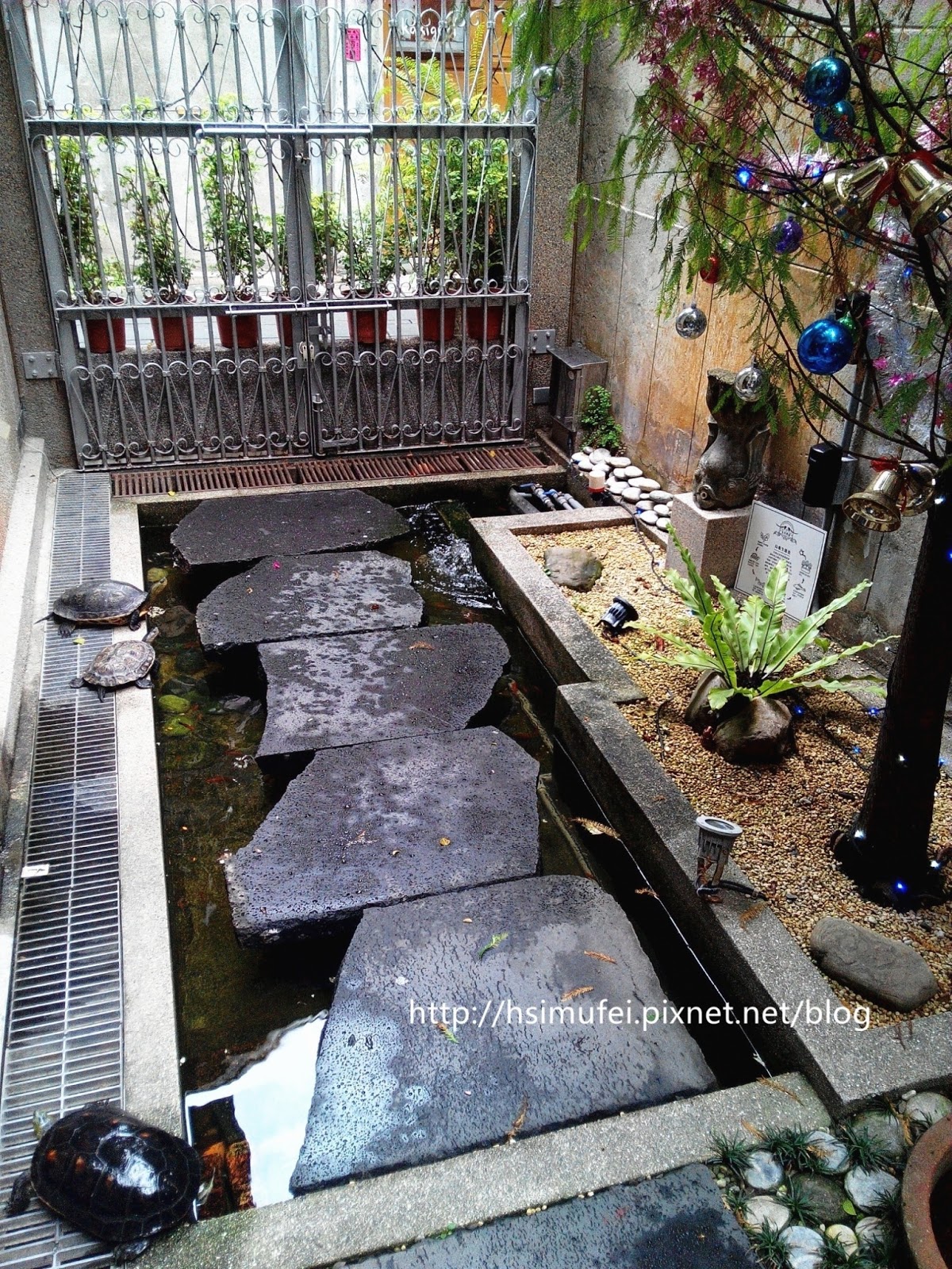 一樓天井處為室外用餐區,白天時採光很充足,一旁還有舊式造景與養有烏龜的水池。