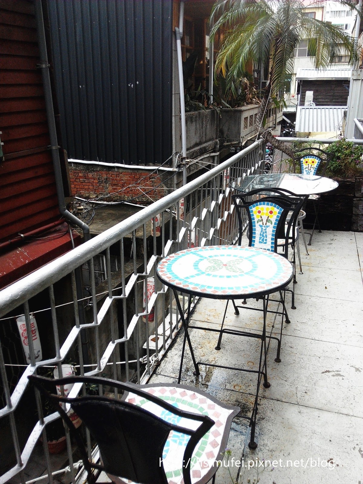 另一側陽臺放了兩組馬賽克風的桌椅,也很有復古的味道。