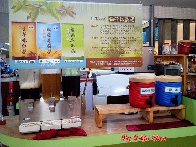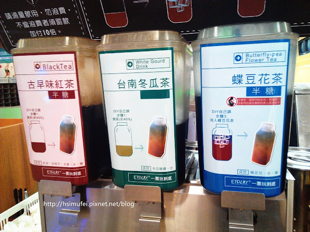 飲料有半糖蝶豆花茶、半糖古早味紅茶、冬瓜茶等,旁邊也有豐年果糖、冷開水與冰塊可調整甜度。