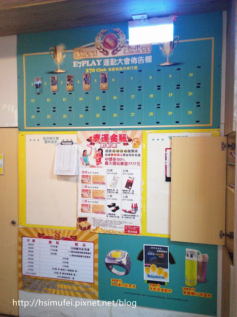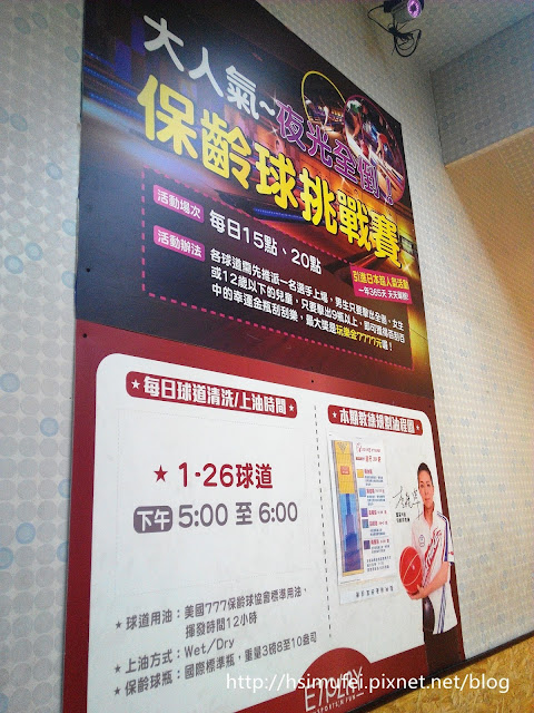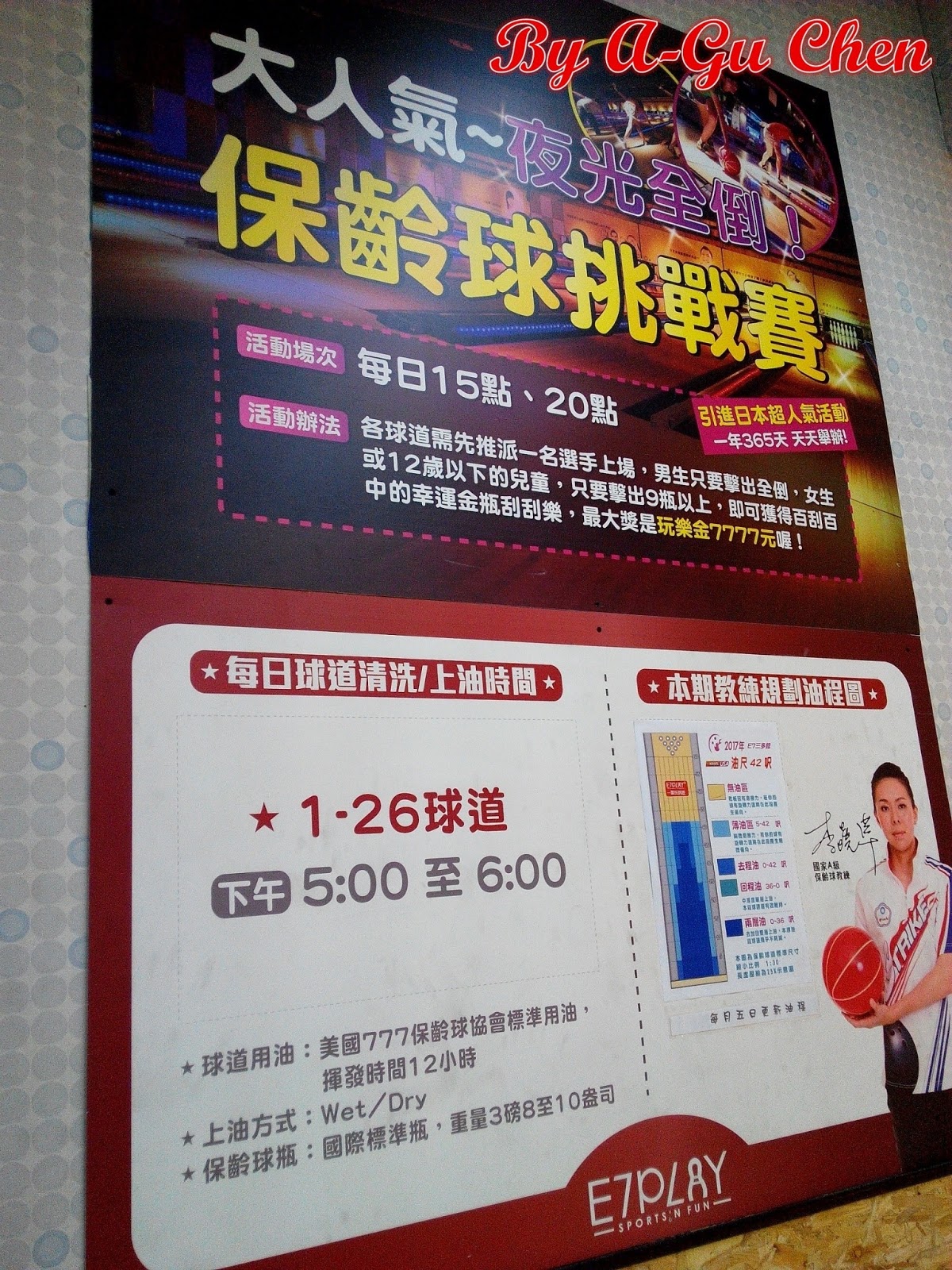 第一球道旁的牆面上貼有夜光全倒活動說明,每天下午三點與晚上八點為活動時間,屆時全館燈光會暗下來,只要擊出全倒便可獲得刮刮樂機會,最大獎為現金7777元。