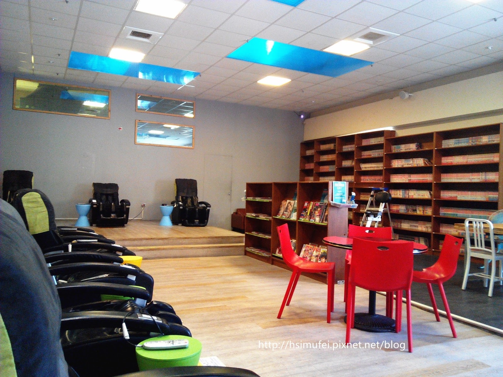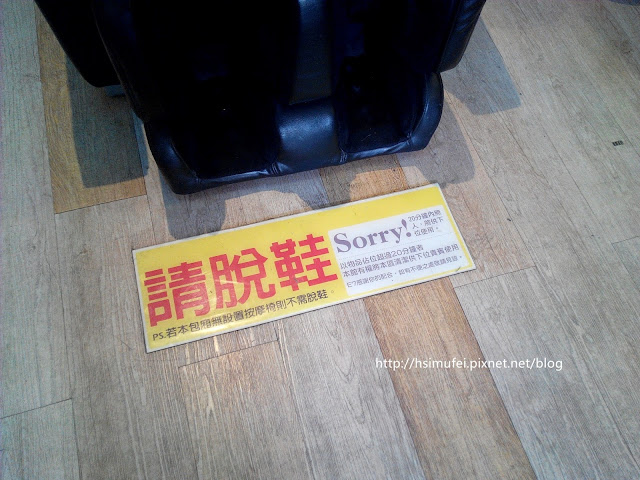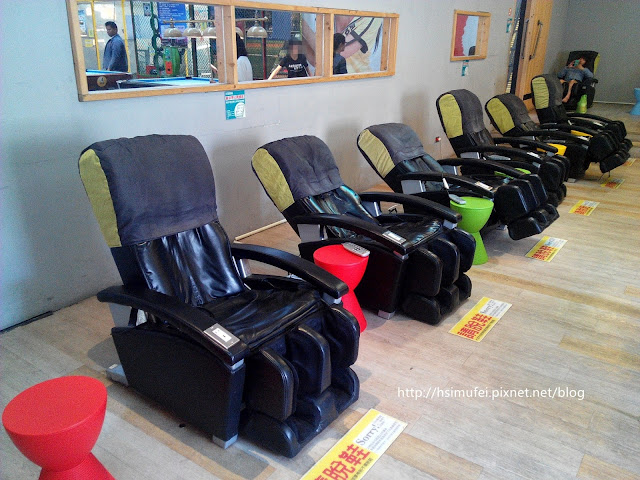 此區共有九座按摩椅,需脫鞋使用。每張右側把手處都設有插座與USB 插孔供客人充電。按摩椅有各種模式,可視需求使用。
