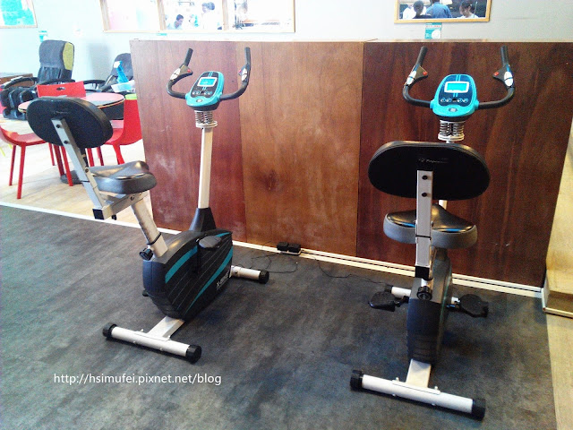 雜誌漫畫區的書櫃後方置有兩臺健身腳踏車。