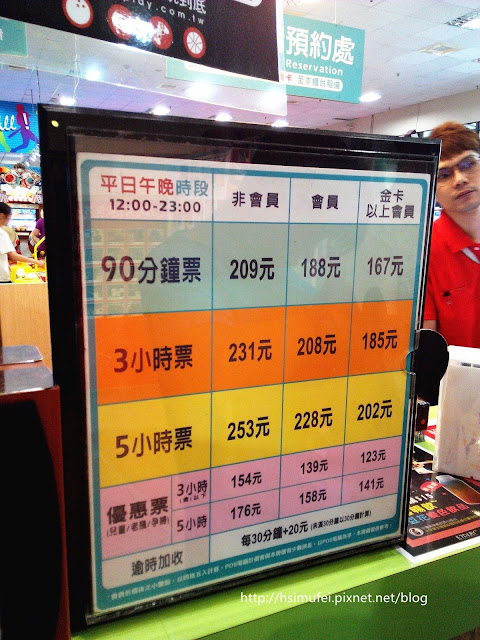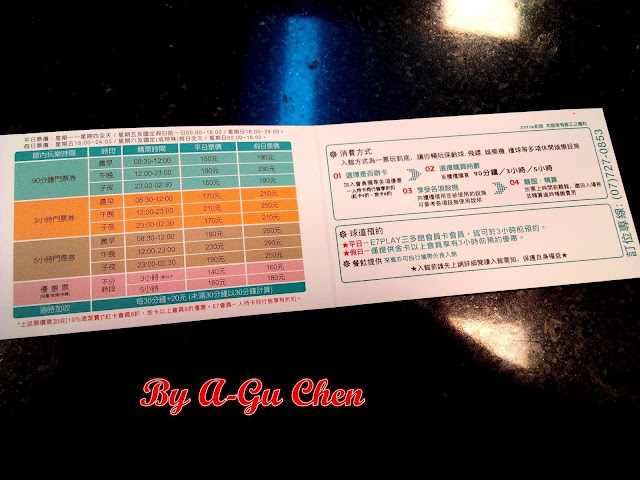 櫃檯上有遊玩時間對應的價位表,玩越久越划算,擁有會員卡或金卡者享有更多折扣。若需館內飲料暢飲,每人可在購買門票時以十五元加購,這時服務人員會給予一個無蓋的小塑膠方瓶,算是「麻古茶坊」飲料瓶的縮小版。