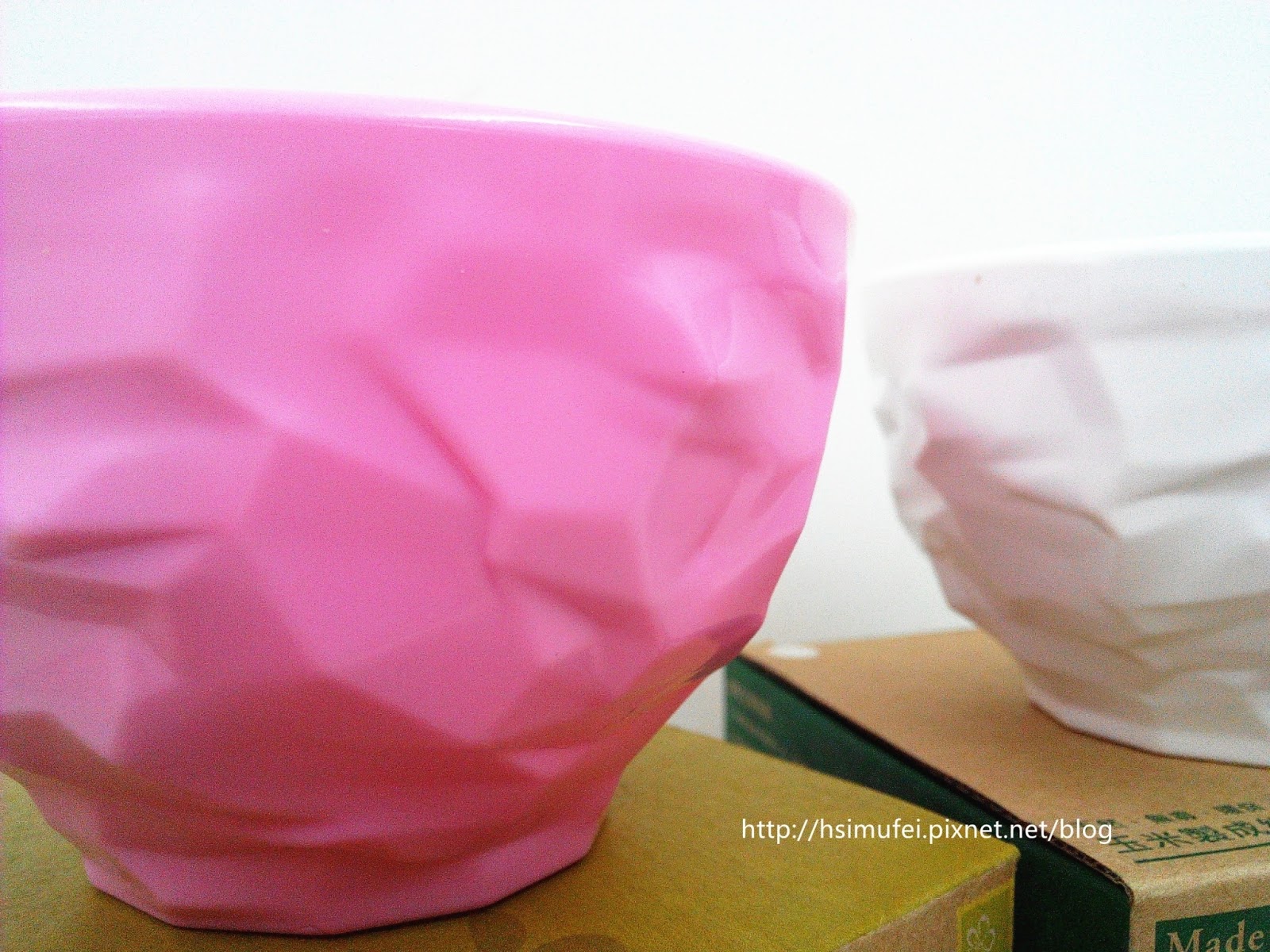 紙盒上貼有圓形貼紙,標示著皺褶碗的顏色。