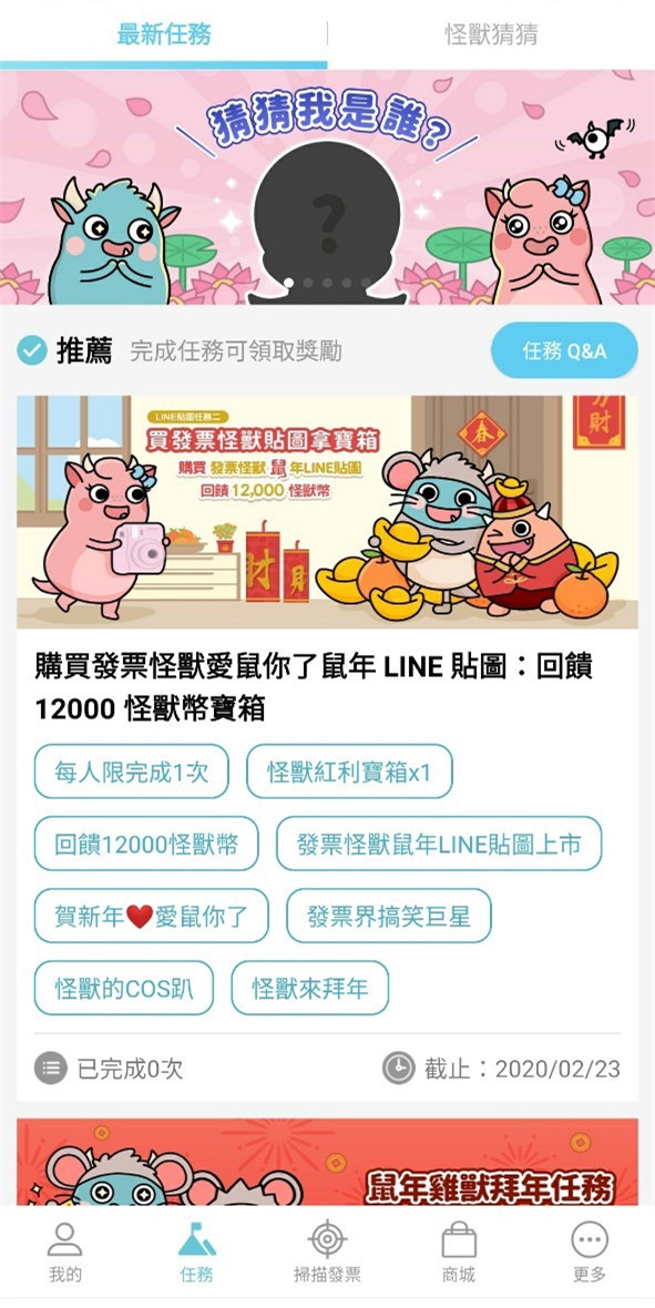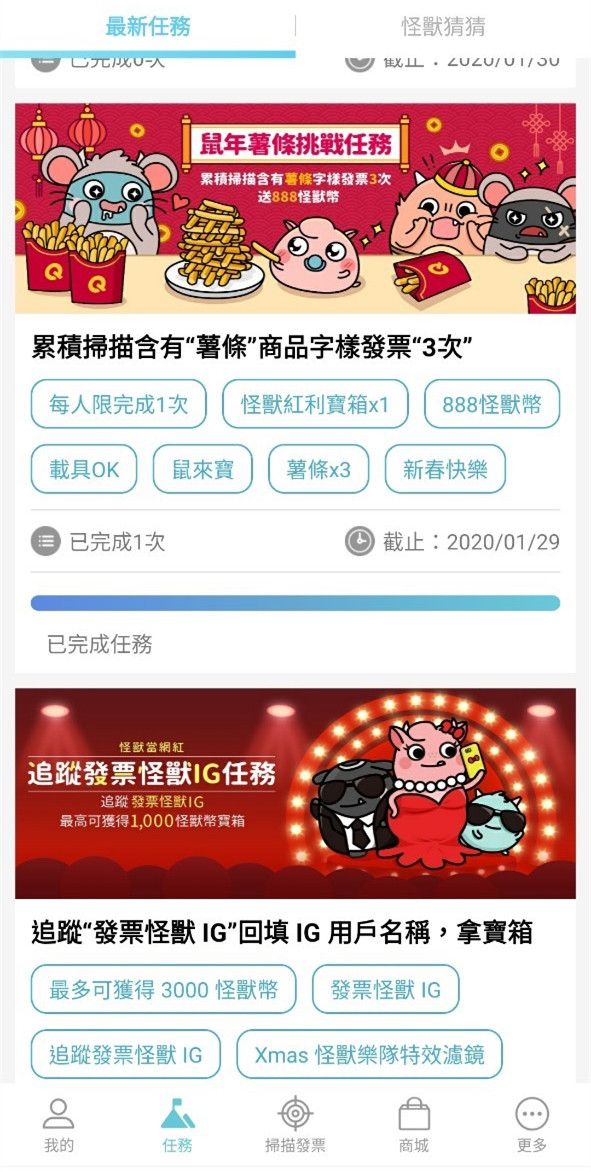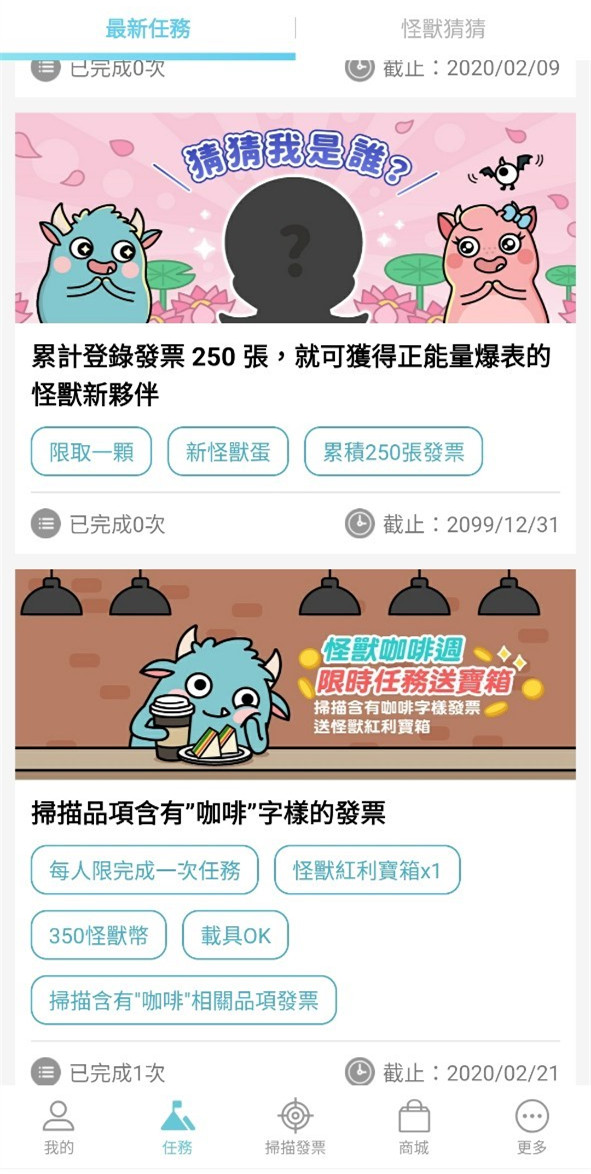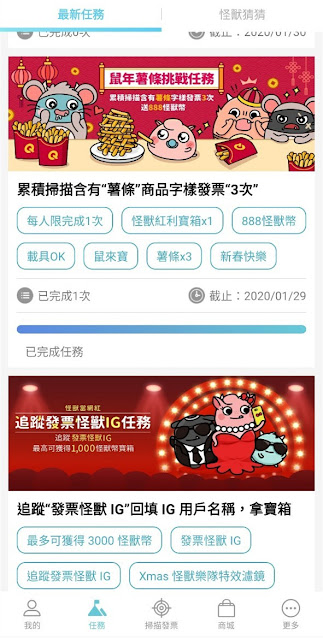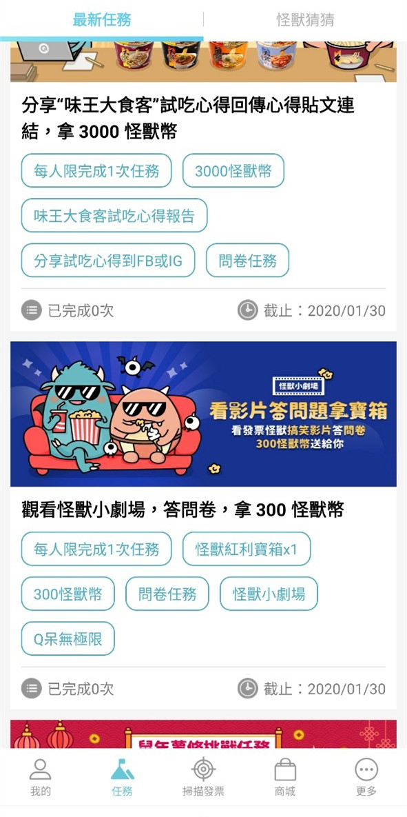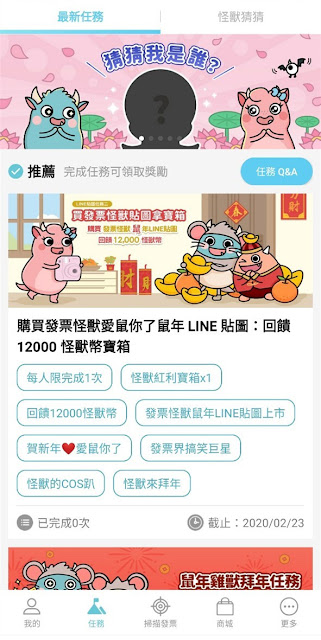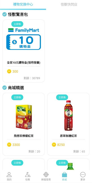 在任務介面中,有不少任務可額外獲得怪獸幣,有些任務有品項張數限定,有的則有看影片填問卷、累積張數、填寫心得等特殊條件任務,給的怪獸幣數量都不少。