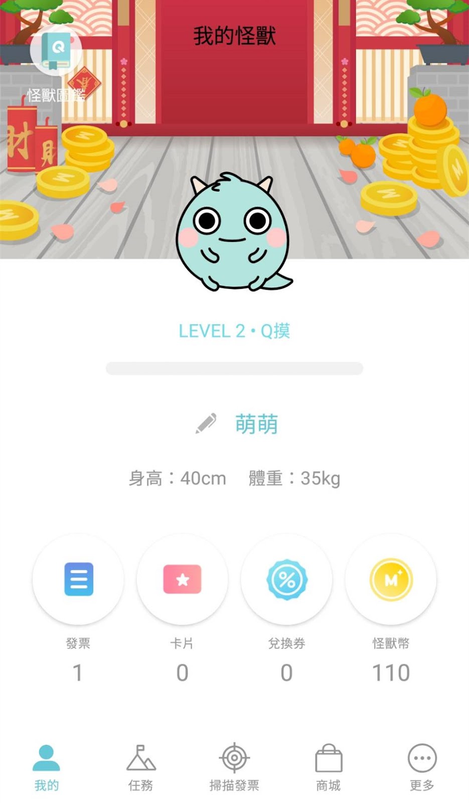 在畫面中會顯示怪獸的身高體重,下方則是發票、卡片、兌換券與怪獸幣總量。
