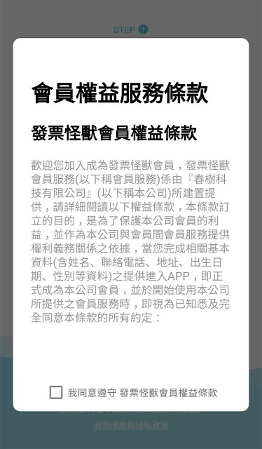 看完萌萌噠介紹後,會跳出會員權益服務條款,需勾選同意遵守才能跳下一個步驟。