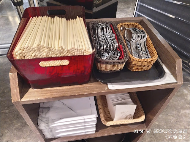 刀叉、湯匙、筷子與餐巾紙需自取,分別放置在取餐區兩個角落。