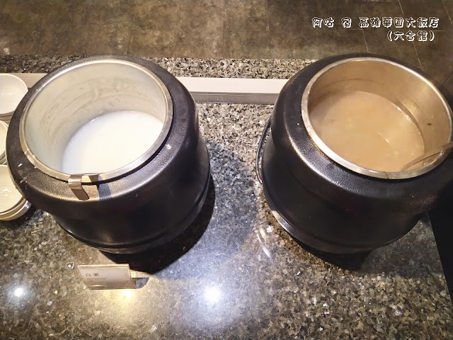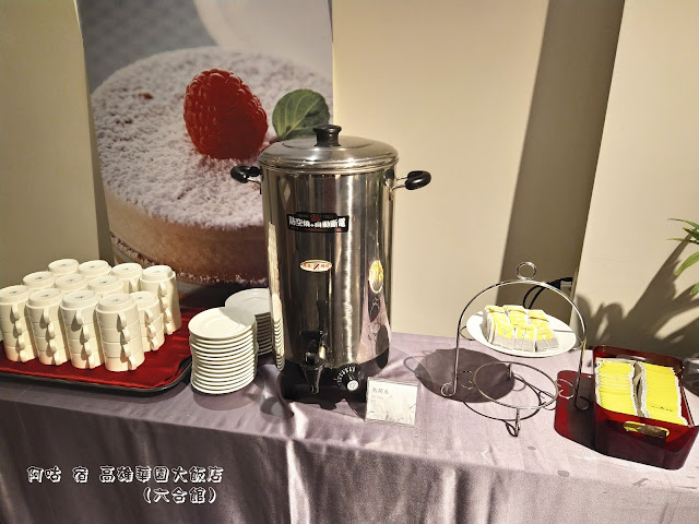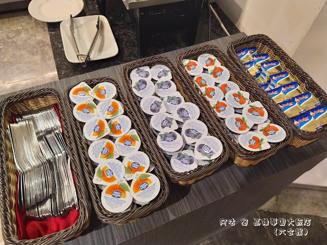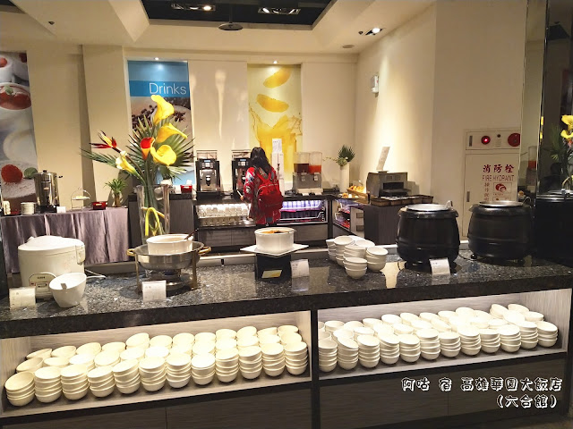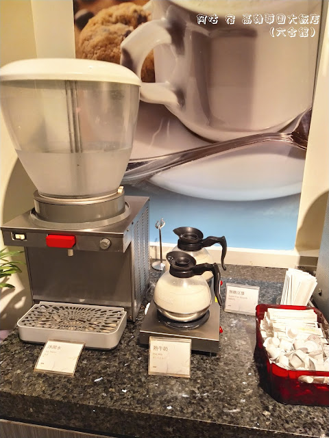 飲品類有熱開水、冰開水、茶包、熱牛奶、無糖豆漿、咖啡機、果汁,並備有糖包、奶油球等,選擇性不少。