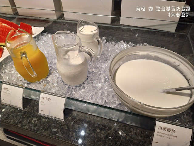 此區提供水果、生菜沙拉、穀片、冰牛奶,冰果汁、優格、草莓果醬與葡萄乾。
