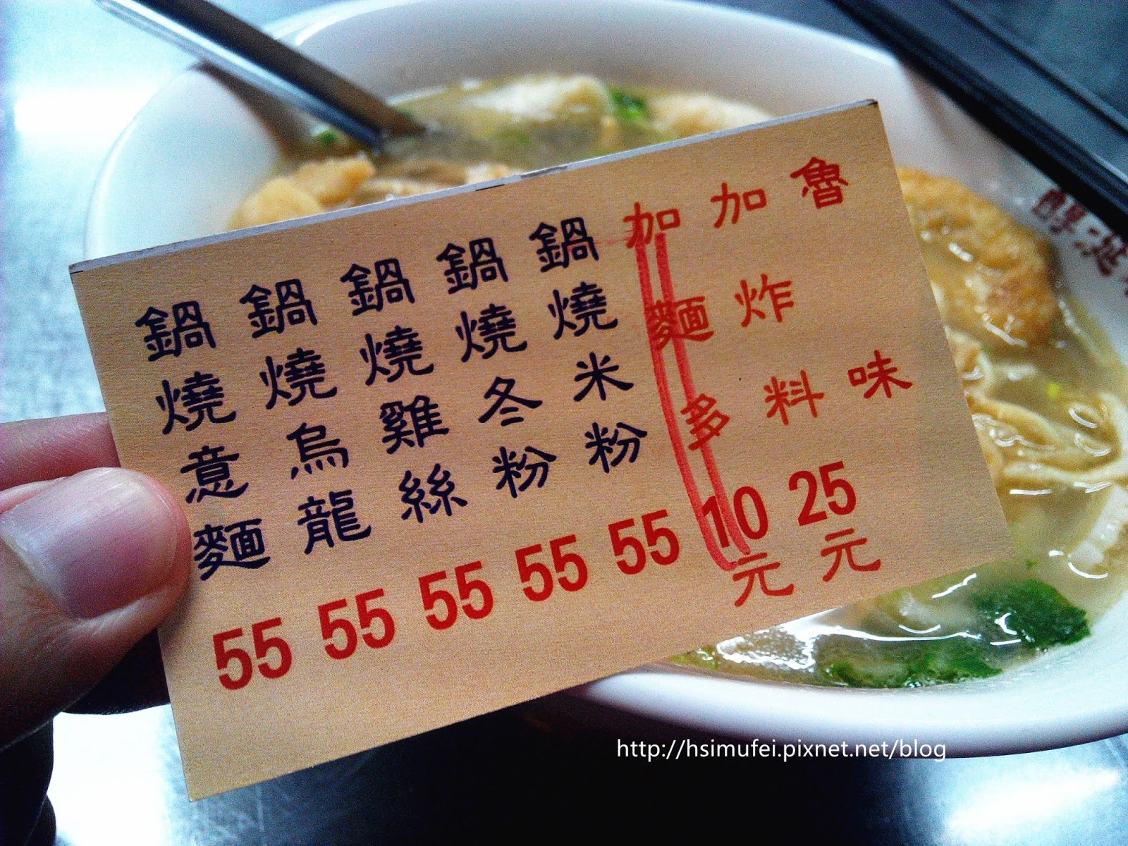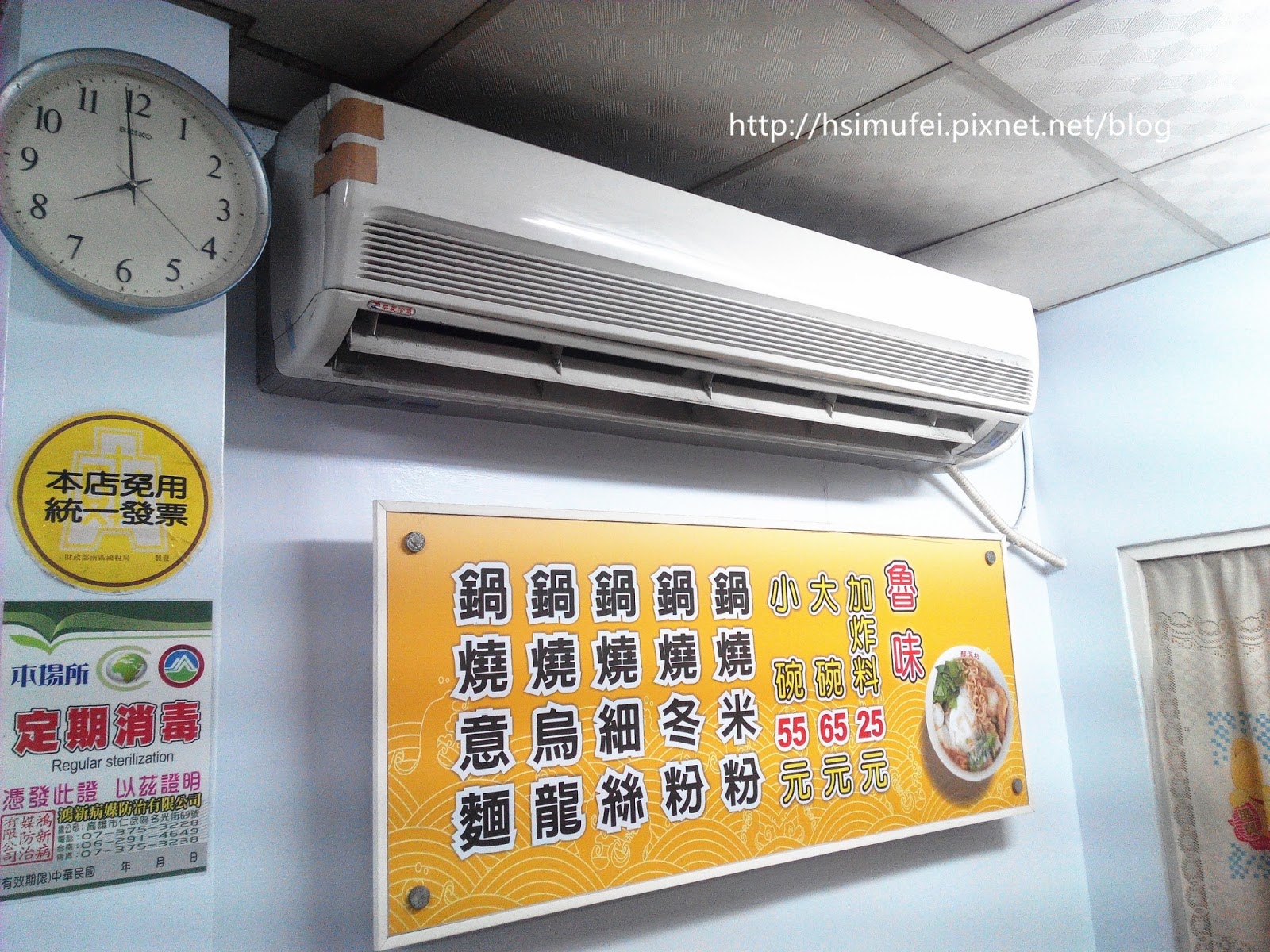 牆面上有餐點價目表,皆為鍋燒系列,可選擇意麵、烏龍、冬粉、細絲、米粉;小碗55元,大碗65元,可以25元加購炸料。