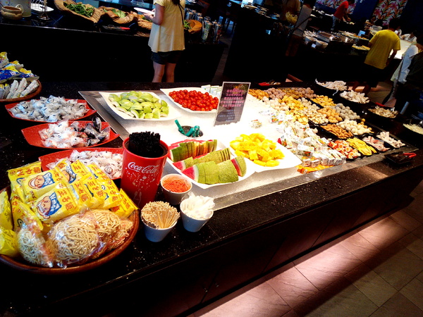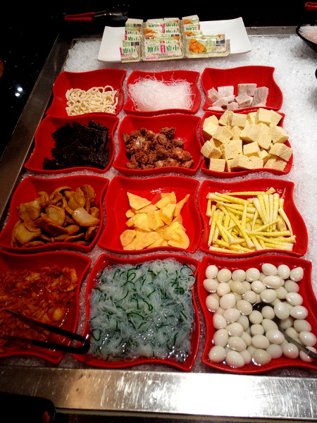 火鍋料種類極多,各式丸子、餃類,基本上想得到的都有,不過倒沒有什麼特別的;麵食類有鍋燒意麵、科學麵和王子麵供選擇,麻糬也有三種口味。