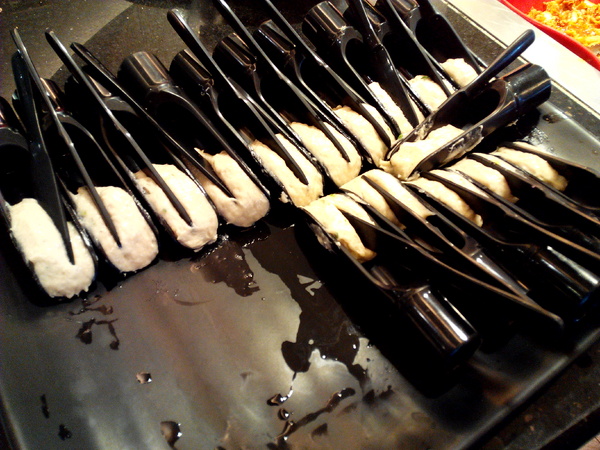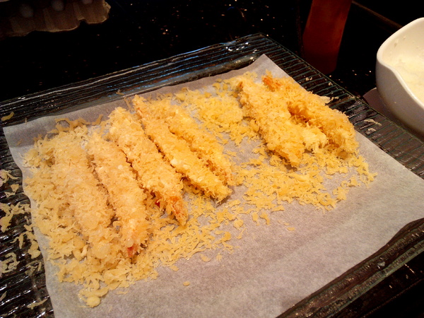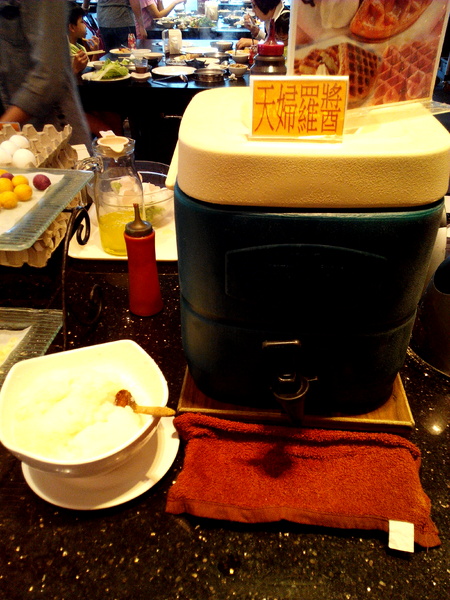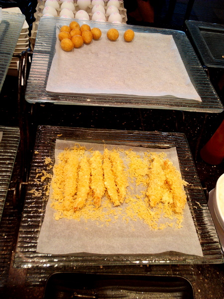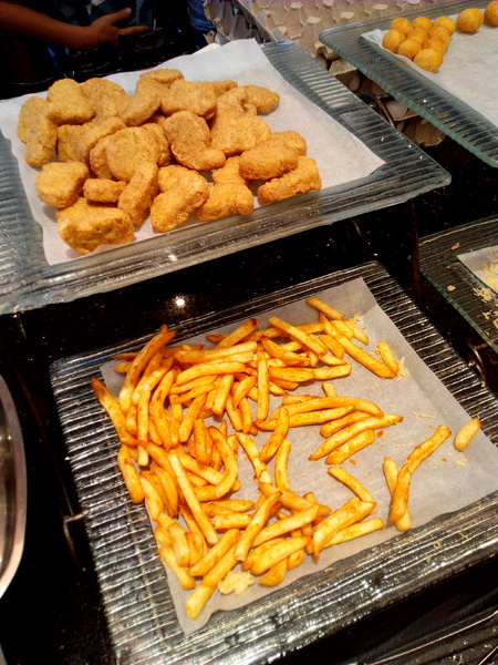宝準備了雞塊、炸湯圓、炸薯條及炸蝦等炸物,其中最熱門的是炸蝦,通常一端出來沒多久就被搶光了。旁邊有蕃茄醬及搭配炸蝦的天婦羅醬及蘿蔔泥供取用。