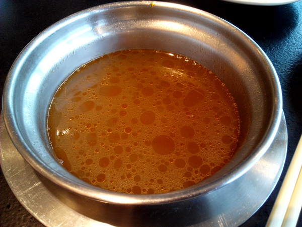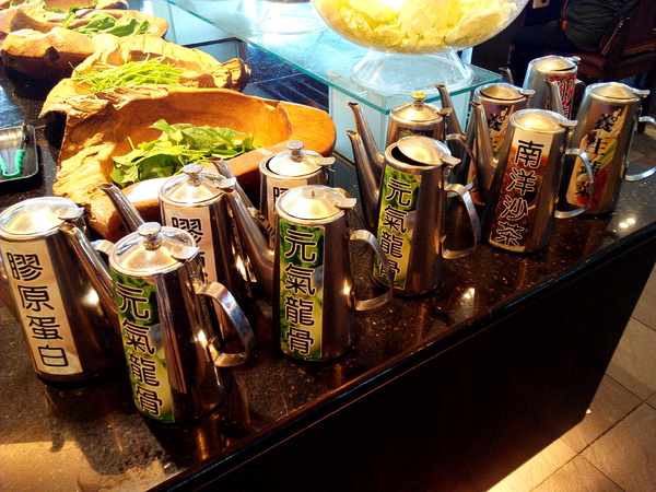 若有需要加湯需自行到蔬菜區旁取用,每一壺上頭都貼有清楚的湯頭標示。
