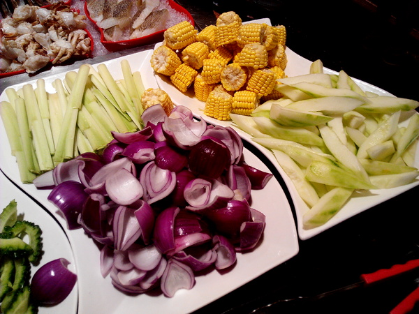 這一區有各種海鮮食材:魚皮、鯛魚、花枝、蝦、螃蟹、蛤蜊、曼波魚、淡菜等等相當澎湃,品質佳又新鮮,但以前曾經有過的蚵仔現在好像沒再提供了,有點小失落。