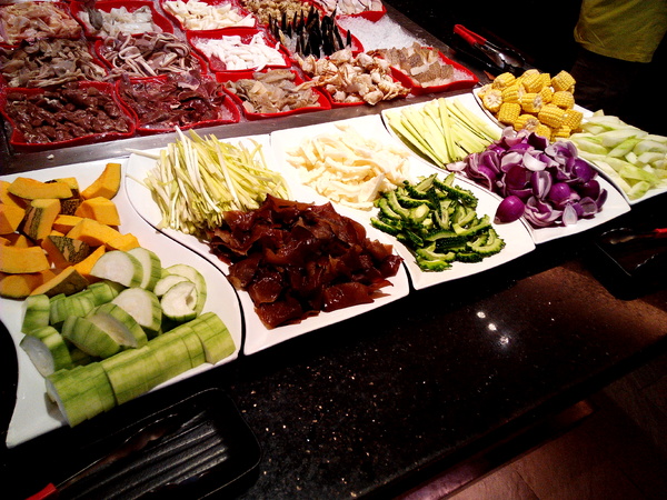 店裡的肉類採自助式,提供的是現切的新鮮肉品,光是牛肉就有霜降、梅花、雪花三種選擇,梅花牛肉瘦肉部分較多,霜降牛肉肥瘦各半,雪花牛肉白肉部分較多,各有各的忠實擁護者。