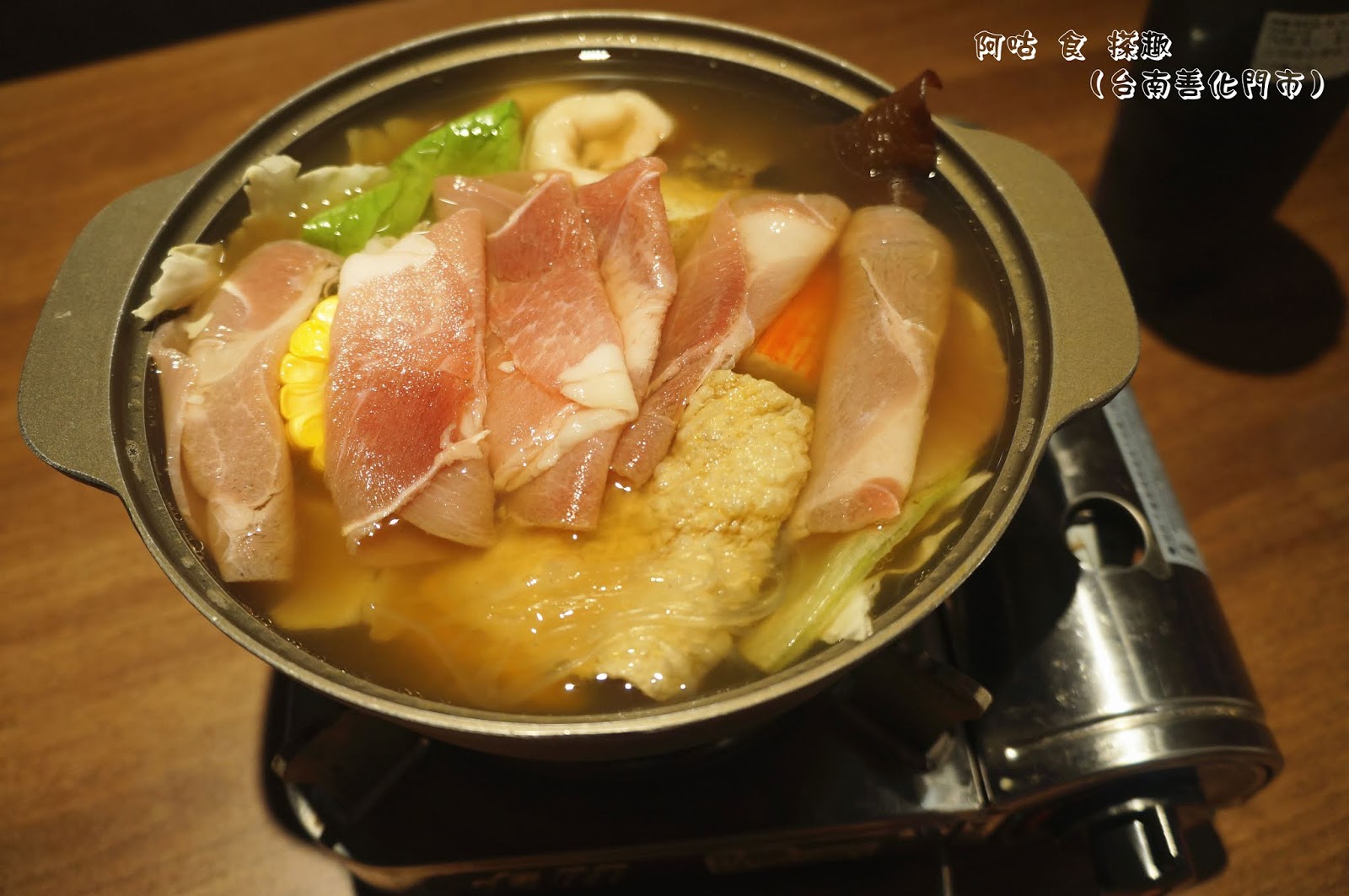 火鍋內容有梅花豬肉、豆皮、魚餃、玉米、高麗菜、小白菜、蟹味棒、黃金魚丸、豆腐、南瓜、米血、金針菇、冬粉、蛤蜊與魚蛋捲,以個人鍋而言算是相當豐富,品質也頗新鮮。