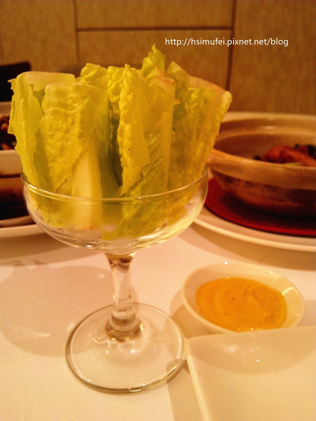 隨著脆皮燒肉會附上相對應數量的蘿蔓生菜葉以及黃芥末沾醬,吃法有點類似韓式燒肉。