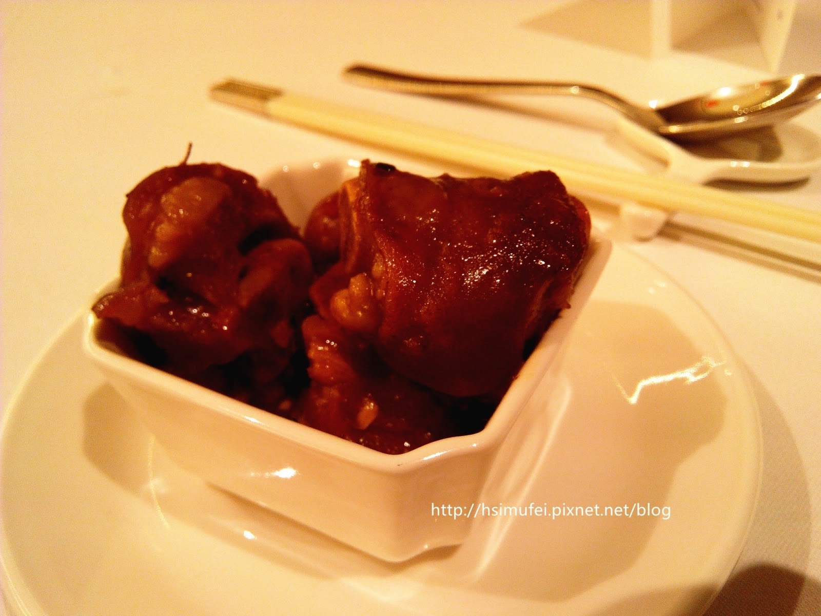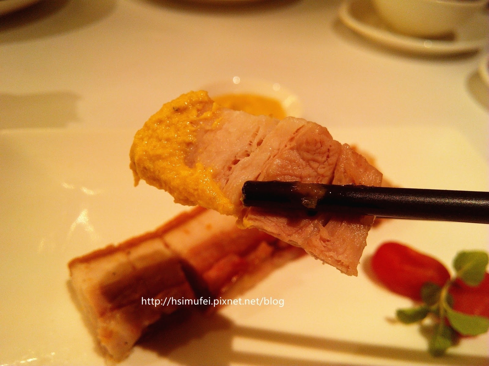 脆皮燒肉,亦稱「火肉」,是港式便當店很受歡迎的主菜之一,個人大學時期第一次在便當店嘗過後便不可自拔地愛上了。在MENU上看到這一道菜,當然要點來嘗嘗高級餐廳等級的脆皮燒肉味道究竟如何囉!