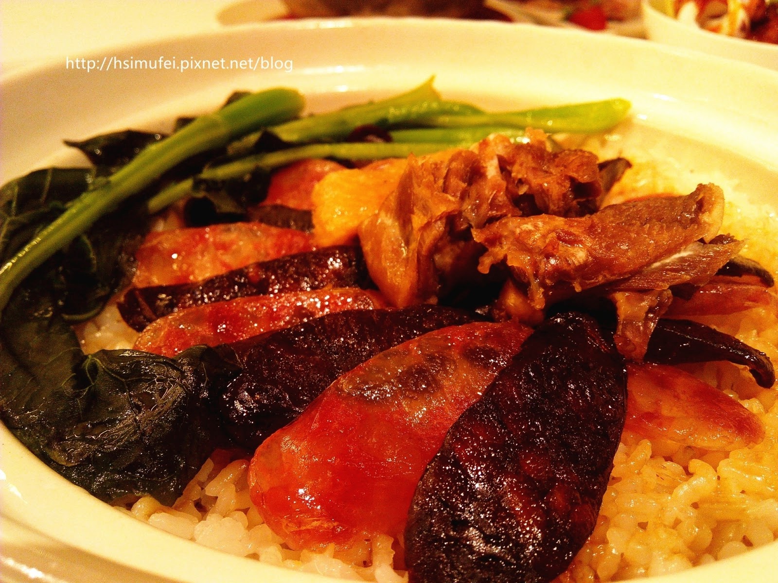 雙腸指的是臘腸與肝腸。除了兩種腸類相間平舖在放上,還有兩塊烤鴨肉,一旁則以菠菜陪襯顯色。
