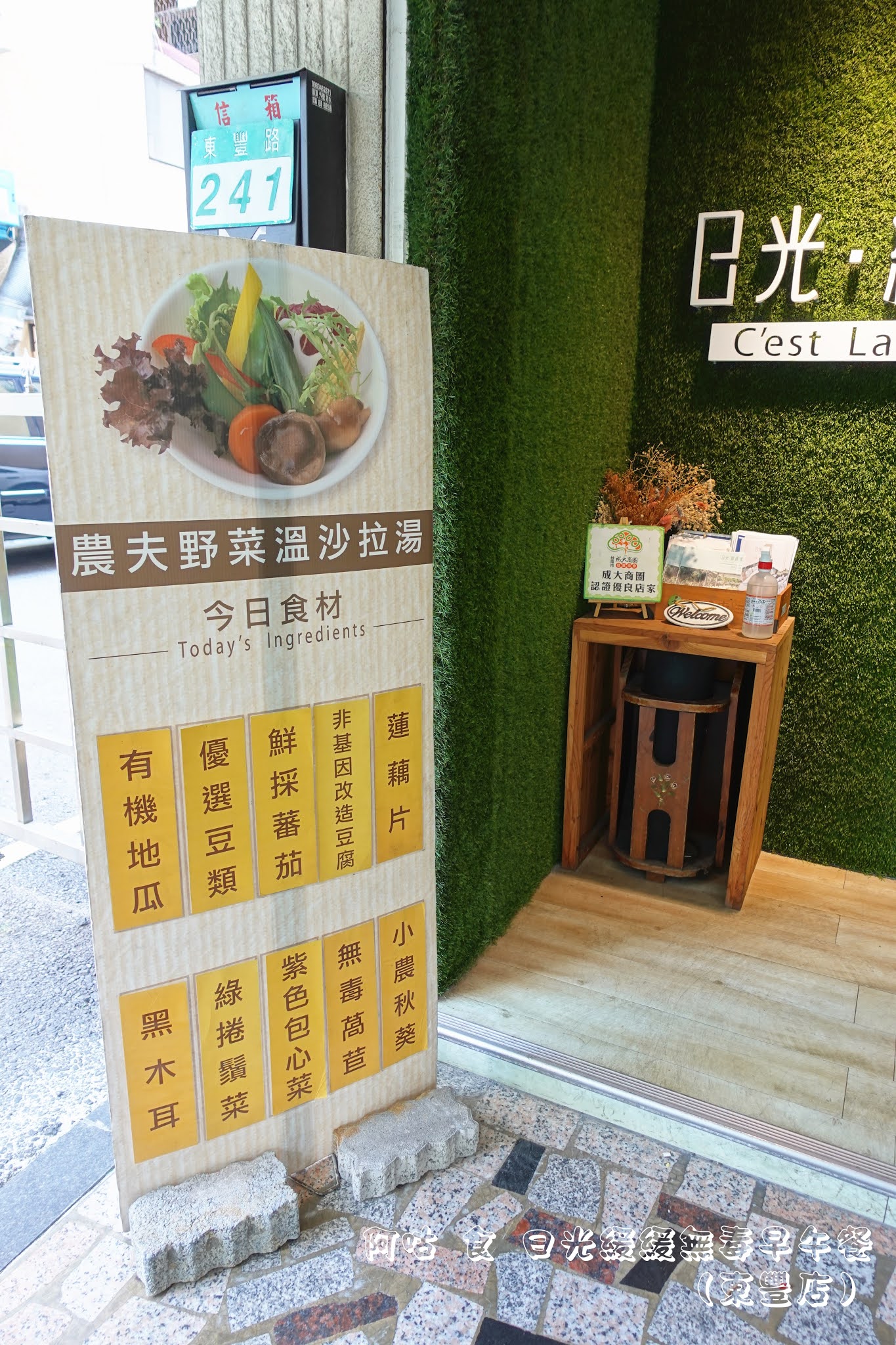 門口立牌內容為當日農夫野菜溫沙拉湯使用的食材公告,入口處則備有酒精供客人消毒。