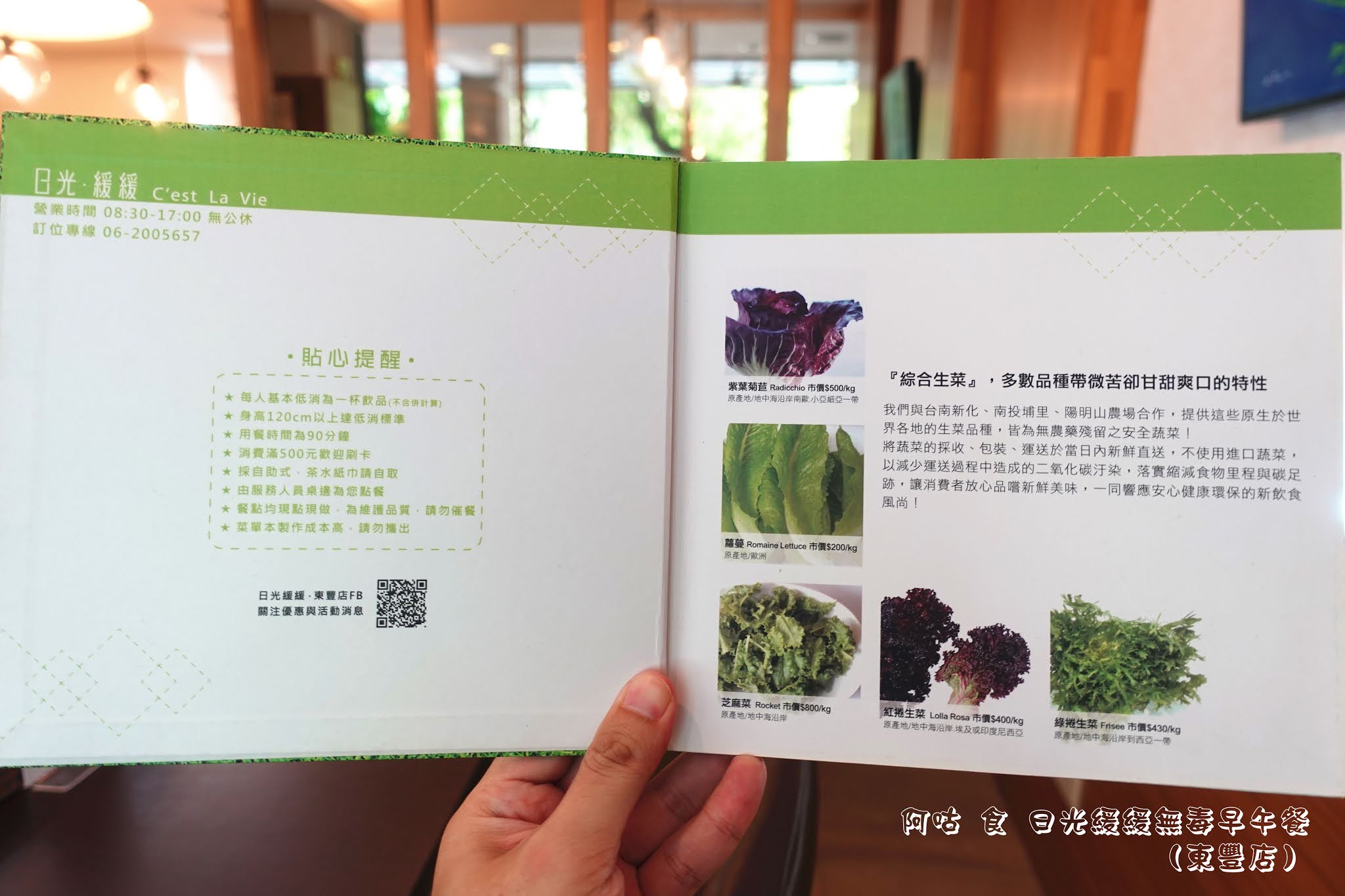 日光緩緩的餐點主打無毒有機食材,與多區農場合作,蔬菜皆為當天新鮮直送,以環保、少碳、健康、新鮮為訴求。