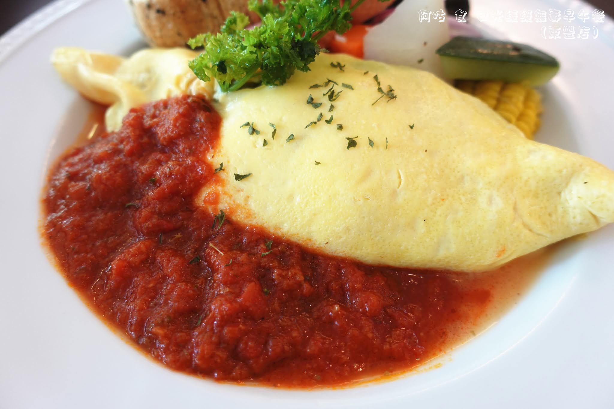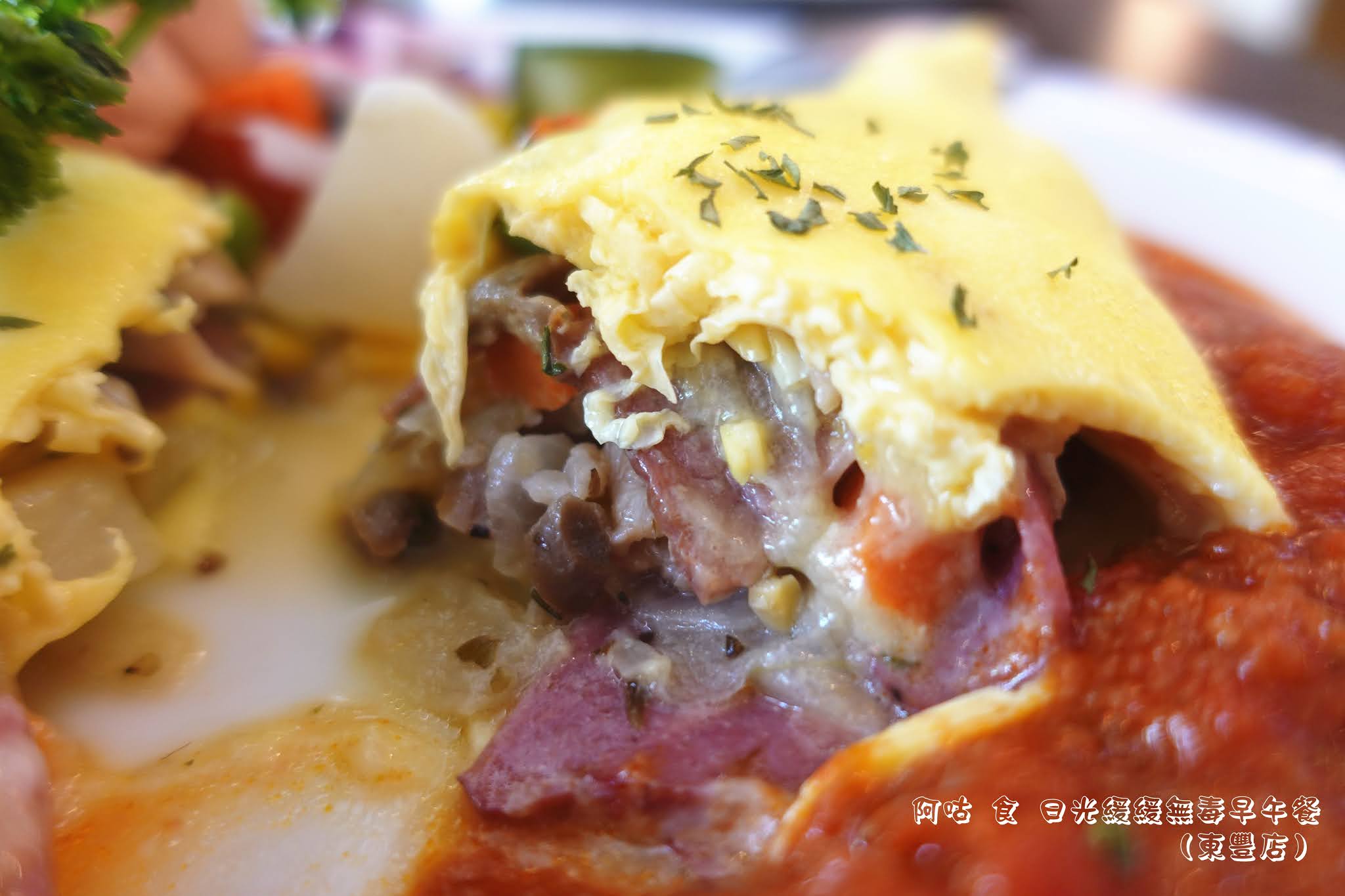 滑潤軟嫩的歐姆蛋皮下裹著大片煙燻牛肉與洋蔥、香菇等多樣蔬菜內餡,牛肉的煙燻香氣頗明顯,鮮嫩不老,多種蔬菜混合的內餡脆甜腴滑,整體在滋味與口感上都頗富層次,再佐以酸香開胃的蕃茄糊享用,更是別具一番風味。