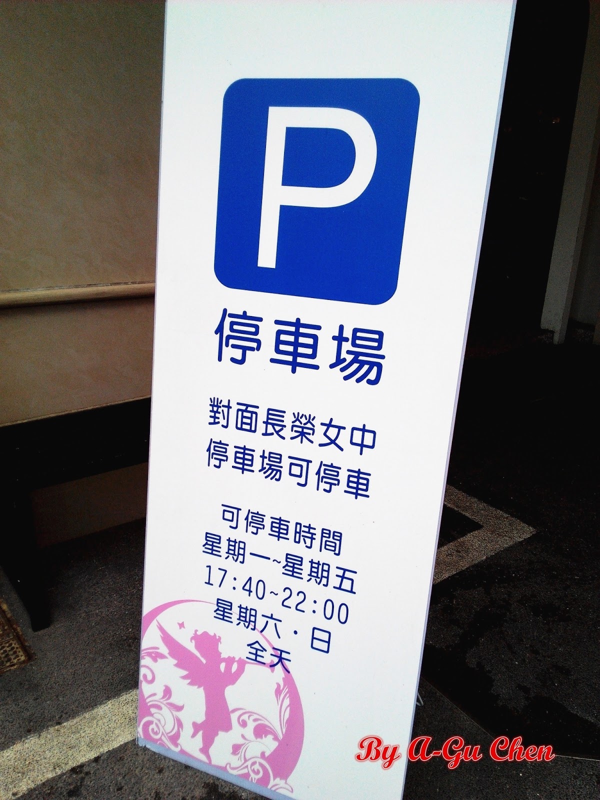 招牌以桃紅色與白色為主,上頭還有個吹著樂器的小天使LOGO。