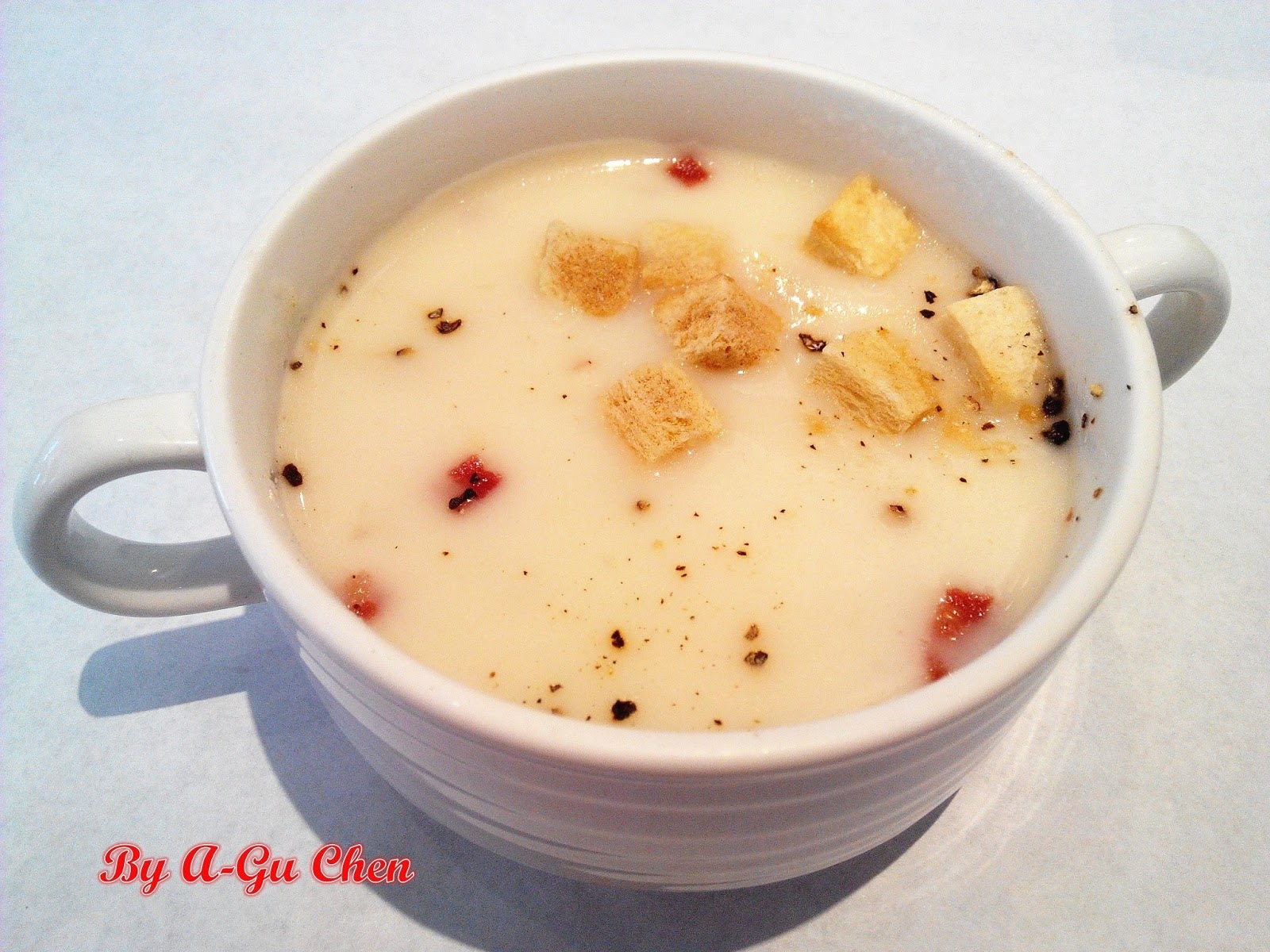 馬鈴薯培根濃湯,以新鮮馬鈴薯切丁後進行熬煮,馬鈴薯丁化開後的澱粉融入湯中,釋放出本身自然的甜味,因此未再額外加糖調味。此外還嘗得到培根特有的燻香及洋蔥的甜香,喝來濃稠卻意外滑順,浮在湯面上的吐司丁則增添了咀嚼的口感。